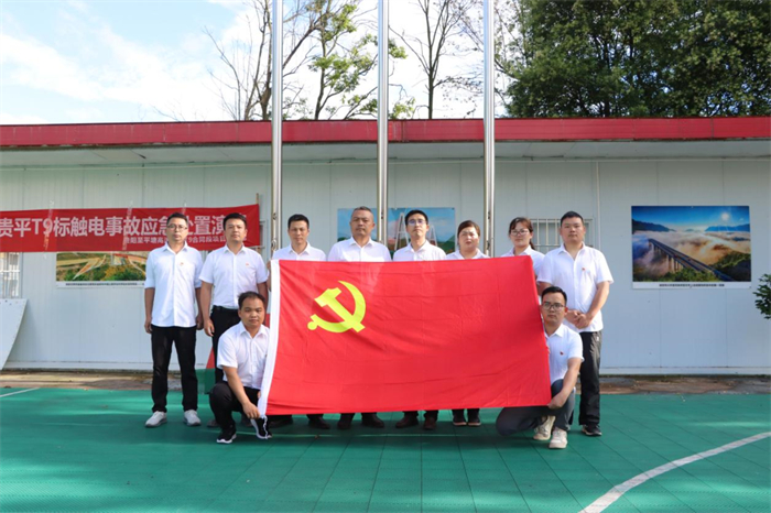 第九工程公司贵平8、9标项目联合党支部党员与党旗合影