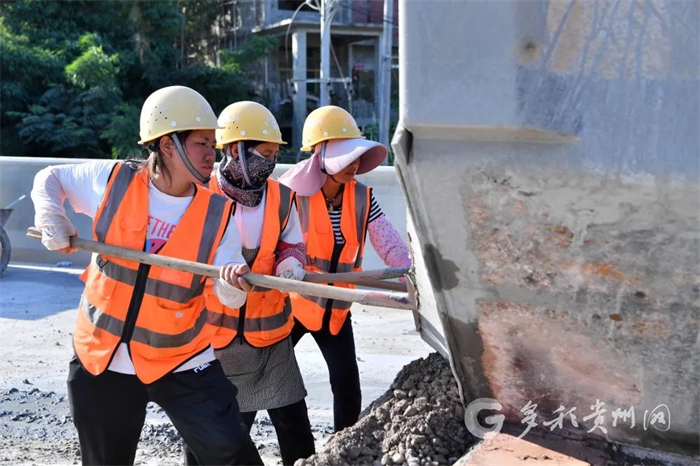 项目部女施工人员正在对水泥稳定碎石基层摊铺(一)