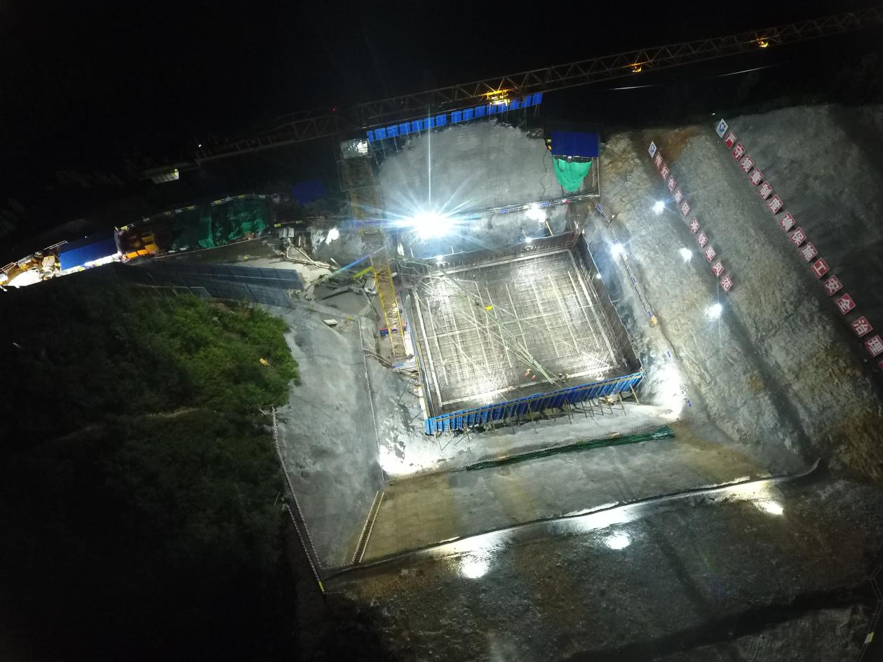 六车河大桥10号拱座基坑为倒四棱台型,是由37.2×31.8×19.9米四棱台型墩台+16颗直径为3.2米桩基组成,桩基长度为16至50米,6月25日,10号拱座桩基全部浇筑完成。10号拱座混凝土设计方量为17589.9立方米,分4次浇筑完成。
