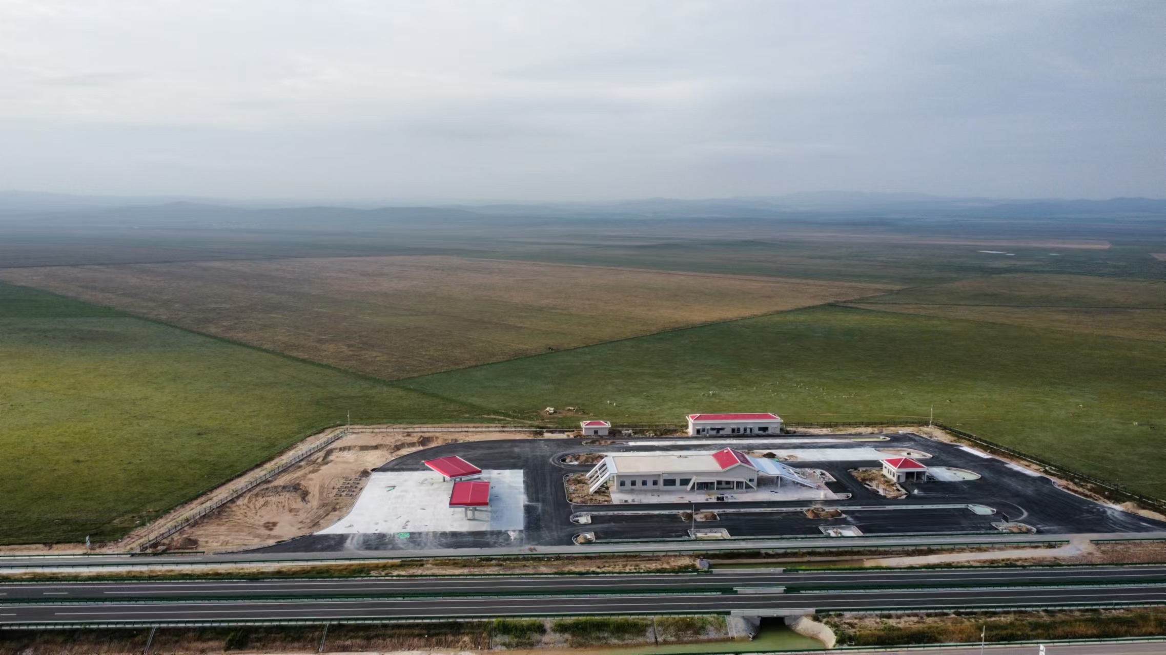 安公高速AGZCB-1房建项目建筑面积14105.24㎡,室外工程950709.30㎡,拆除工程298.33㎡,包含明安图收费站、星耀收费站、明安图服务区南区、北区和原有建筑改造工程,先后于2022年6月8日和10月14日完成了全线房建工程的基础首件和主体首件工程。