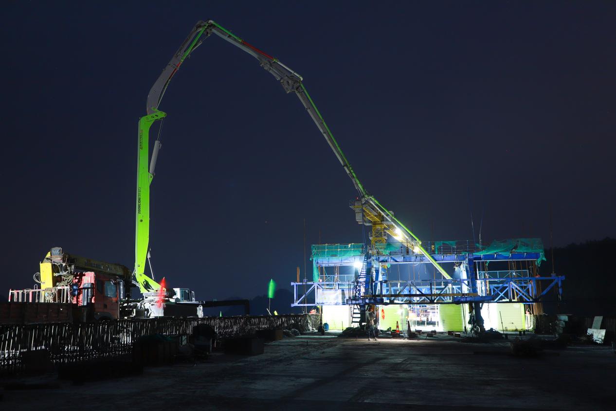 “混凝土浇筑过程中,大型水箱同步放水‘减负’,是保持大桥整体均衡、保证施工质量的重要手段。”项目负责人介绍道,选择夜间低温时段施工,是鉴于混凝土热胀冷缩的特性,以保证合龙段的施工质量。