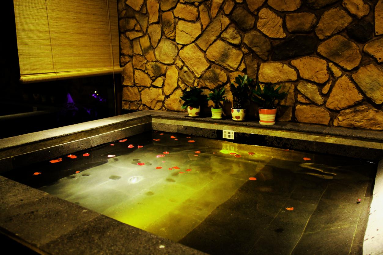 套餐包含:双床房3间、大床房1间,温泉门票8人份,自助早餐8人份,室内泡池2个,室外泡池2个。