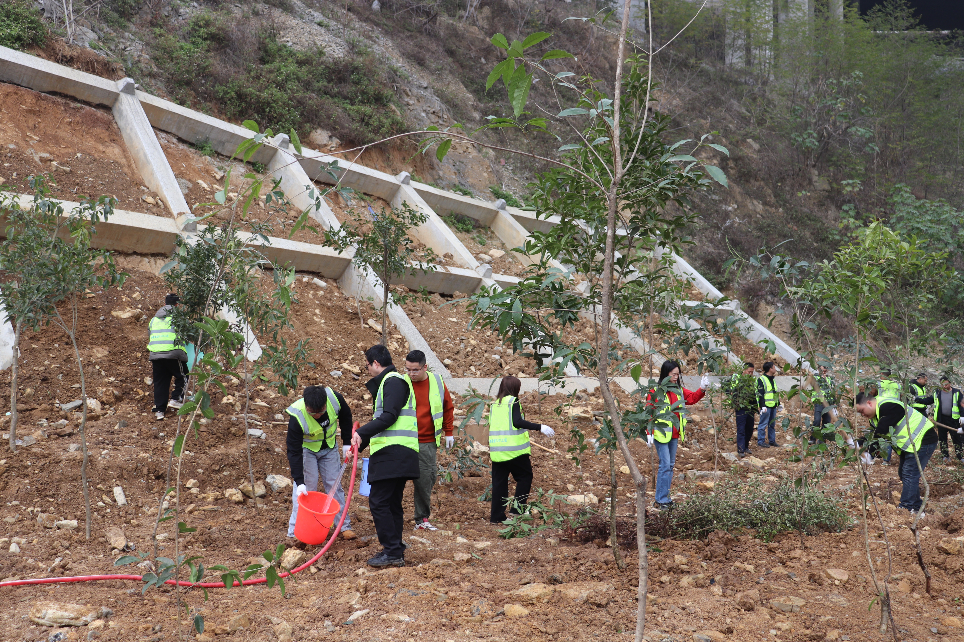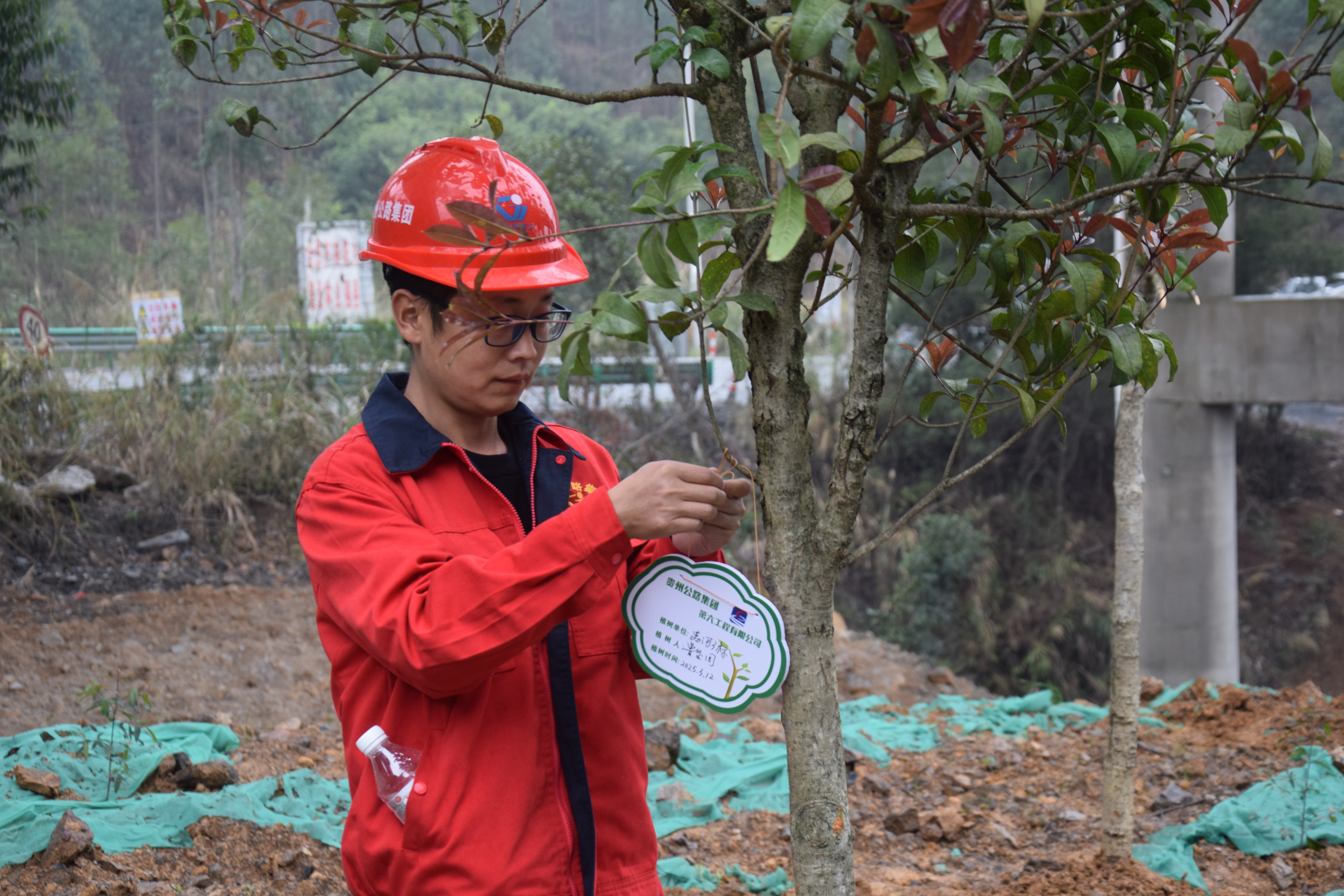 在大沙坡大桥弃土场,荔河3标的职工们早早来到植树现场领取植树工具,大家或两两合作,或三五成群,挖坑、栽树、覆土、踩实,干得十分起劲儿,短短1个小时就种下了20余株桂花树。活动还设置了“认养树苗”环节,职工们亲手栽种的树苗挂上专属铭牌,并写下心愿寄语,为这份绿意赋予了更多美好期待。