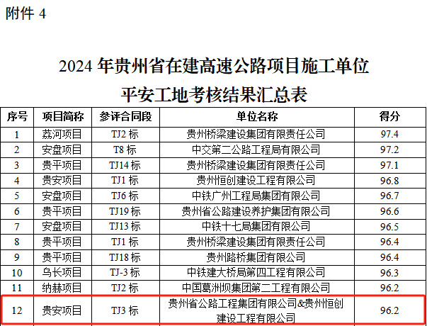 近日,贵州省交通建设工程质量监督执法支队公布了贵州省2024年度高速公路建设项目平安工地考核结果,由贵州公路集团第三工程有限公司承建的贵安扩容3标获评2024年贵州省平安工地示范项目,这是贵安扩容3标自2023年以来凭借扎实的安全管理成效连续两年获评。