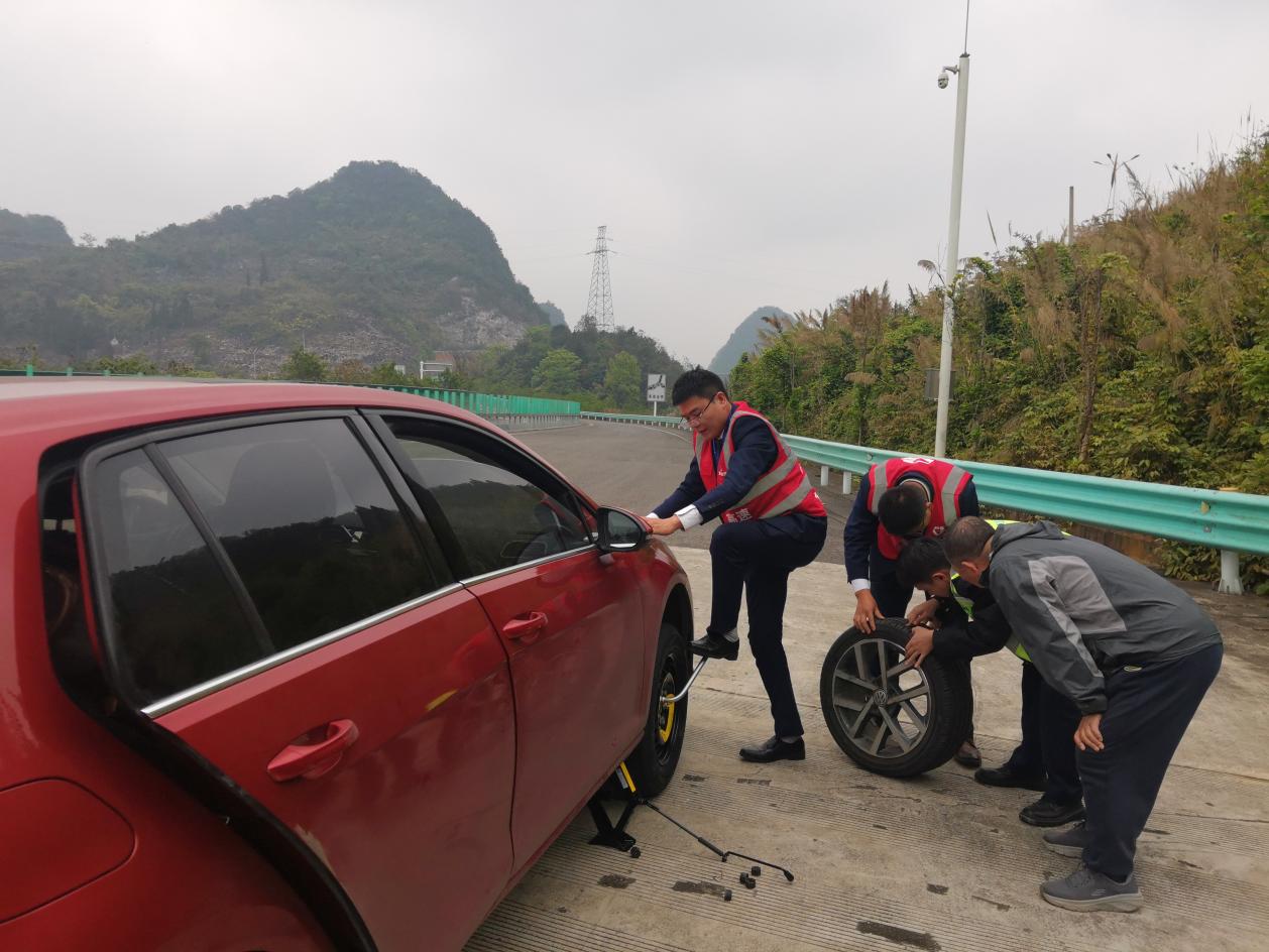 11时40分,一辆红色轿车停在景峰站内广场,节假日期间过往车辆较多。入口站务员张丹发现异样后,立即上前询问。得知两位司乘是从北京来贵州自驾游的退休老人,因车轮爆胎不知所措。张丹迅速通知出口站务员何超宇和当班总务罗原原。何超宇一边安抚老人,一边查看车辆情况,称自己可以帮忙更换轮胎;罗原原则为老人导航修车厂,介绍当地景点。不到20分钟轮胎更换完毕,老人紧握工作人员双手连声道谢。