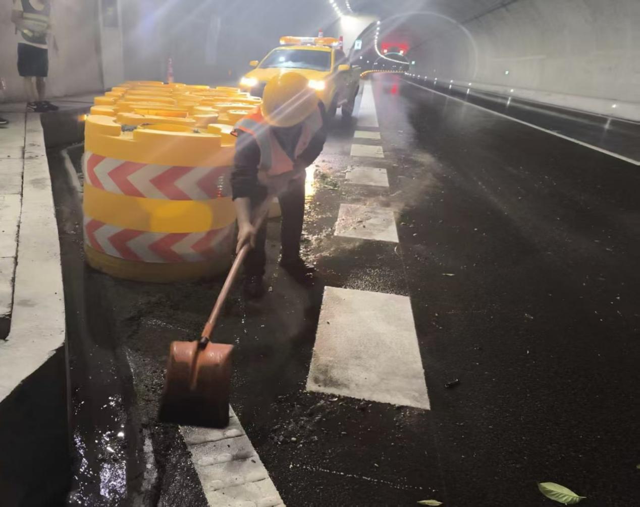 接气象预警后,应急队8名应急队员、10名养护队员于5分钟内集结完成,分4组携带油锯、铁锹、排水钩等工具赶赴现场,沿路清理倒伏树木等散落物,修复被掀翻的隔离栅并设置反光锥引导车流,同时清除排水沟内堆积的树叶、淤泥,保障强降雨期间排水通畅。经过连续6小时奋战,顺利完成抢险保通任务。