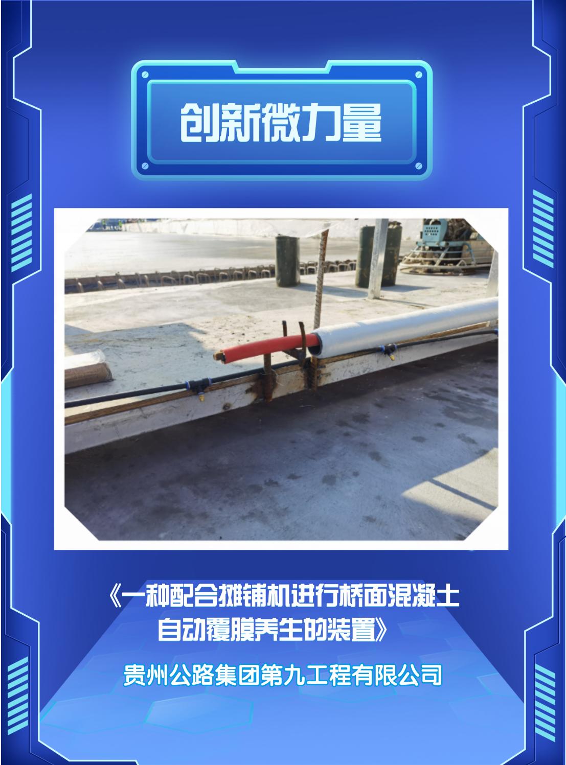 在贵州高原的崇山峻岭间,一座座跨江大桥拔地而起。而在桥面混凝土铺装这道关键工序中,一项源自基层的创新发明正悄然改变传统施工模式——贵州公路集团第九工程有限公司青年团队自主研发的“一种配合摊铺机进行桥面混凝土自动覆膜养生的装置”,通过低成本简易改造,实现养护效率与质量的双重飞跃,为西部山区桥梁建设注入新动能。