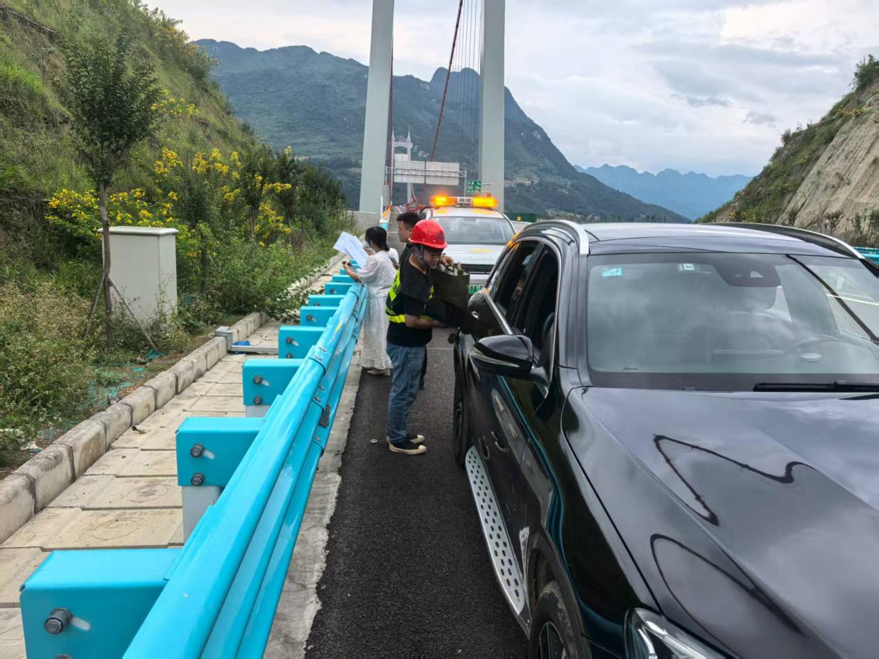 近日,在纳晴高速下行K106+800处,一辆黑色越野车因燃油耗尽停于应急车道,司乘人员面临安全风险。贵州公路集团公路养护分公司纳晴高速白沙养护运维站接报后10分钟内抵达现场,迅速设置警示区域,摆放反光锥筒及提示标志。