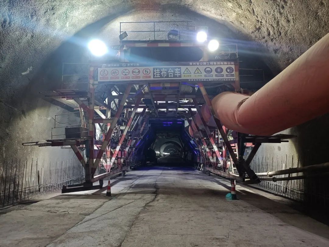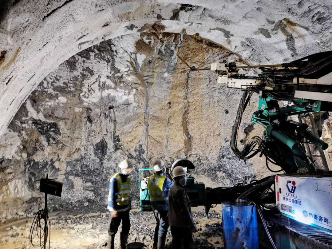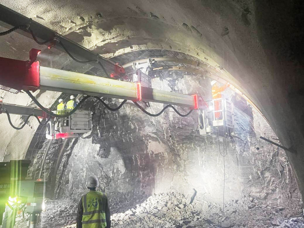 蔡家梁子特长隧道穿越多条断层破碎带和不同地层,有岩溶发育、突泥涌水、富水等多种特殊地质风险,且项目地处大娄山延伸段向四川盆地过渡的斜坡地带,场区海拔介于 683.7m—1532.9m,相对高差 849.2m,施工难度大,安全风险高,对项目建设者的技术水平和管理能力提出了极高要求。为保证隧道工程安全质量和施工进度稳步推进,项目提前谋划、积极应对,认真学习隧道先进管理经验,优化施工工序,严抓每日进尺,不断加强人、材、机、料的组织配合,并通过引进超前地质钻机、湿喷机、锚杆钻机及隧道多功能拱架安装车等先进机械设备,实现了隧道全工序机械化配套作业,进一步提高了工效品质、工艺标准和安全管理水平,确保了隧道顺利贯通。