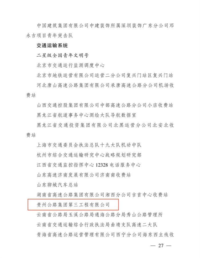 近日,共青团中央、交通运输部等23家全国创建青年文明号活动组委会成员单位联合印发《关于命名第21届全国青年文明号并进行星级认定的决定》,贵州公路集团第三工程有限公司被认定为首批“二星级全国青年文明号”。第三工程公司继2021年荣获“第20届全国青年文明号”称号之后,顺利实现了青年文明号创建工作的提档升级,也成为今年全省交通系统唯一获“二星级”认定的集体。