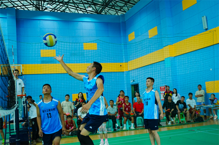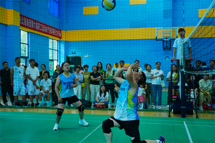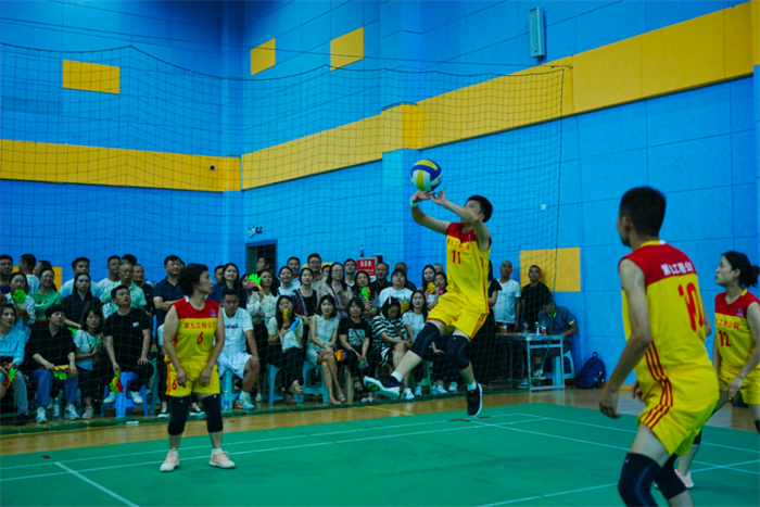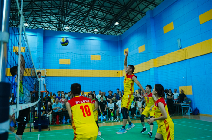 第一局比赛开始,赛场上的激烈对抗就已经开展,双方你来我往,不断制造机会,完成一系列有效进攻。第一局前半场比赛,第八工程公司3次将比分战平甚至反超。下半场比赛,第九工程公司越战越勇,在队友间的默契配合下,上演一个个精彩扣杀,一步步拉开比分差距,最后,第九工程公司以21:14赢得第一局比赛。