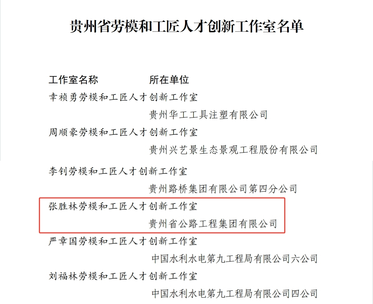 公路集团“张胜林劳模和工匠人才创新工作室”获“贵州省劳模和工匠人才创新工作室”命名