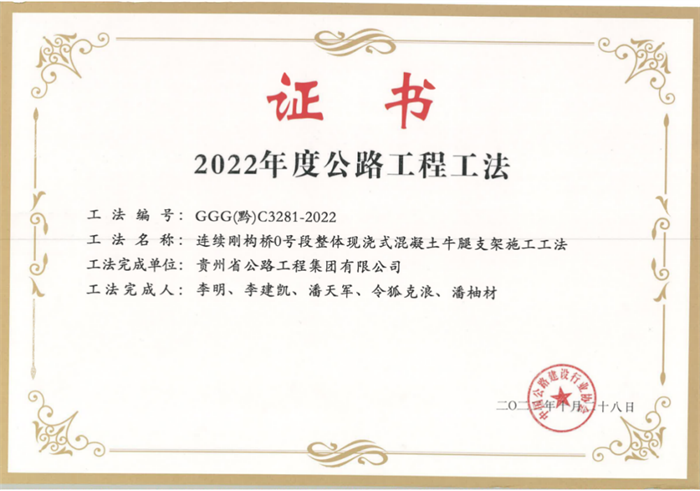 “连续刚构桥0号段整体现浇式混凝土牛腿支架施工工法”获2022年中国公路建设行业协会公路工程工法