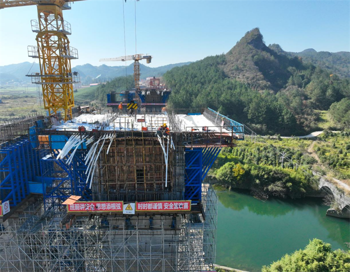 11月28日,由贵州公路集团第九工程有限公司承建的贵平9标首个连续刚构梁--摆龙河大桥6号主墩0号块顺利浇筑完成。