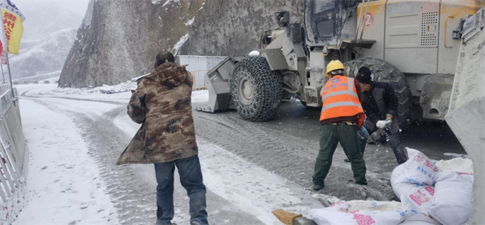 隧道口出现的大面积路面凝冻,不仅行车难,来现场施工的工人更是一不小心就会摔倒,所以每天都会有工人抛洒融雪剂除雪铲冰。“天太冷了,虽然穿得很厚,还戴着手套,不到5分钟,手脚全冻僵。”负责抗凝保畅的班组工人黄龙祥说道。