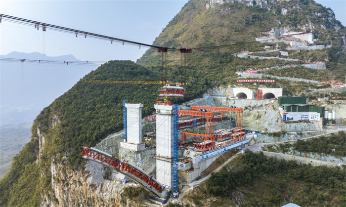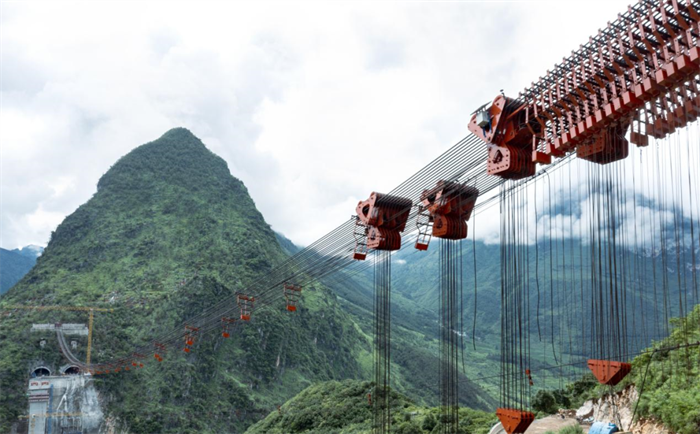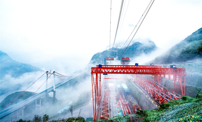 项目建设团队将钢与混凝土组合结构应用技术、液压爬升模板技术、钢结构虚拟预拼装技术、施工与扬尘控制技术等“十项新技术”应用于乌蒙山特大桥的施工建设中。例如乌蒙山特大桥主拱圈在劲性骨架外包混凝土结构的基础上优化成钢桁腹杆-混凝土组合结构,可减轻结构自重30%~40%;主拱圈采用可横移式大吨位无塔架缆索吊装系统进行施工,该系统不设吊塔,而是在两岸山体上布置锚碇,可横移滑块布置在主锚碇上,承重索、牵引索、起重索直接锚固在滑块上,无塔架横移方案减少了横移塔架约2000吨,从而实现节能减碳绿色施工目标。