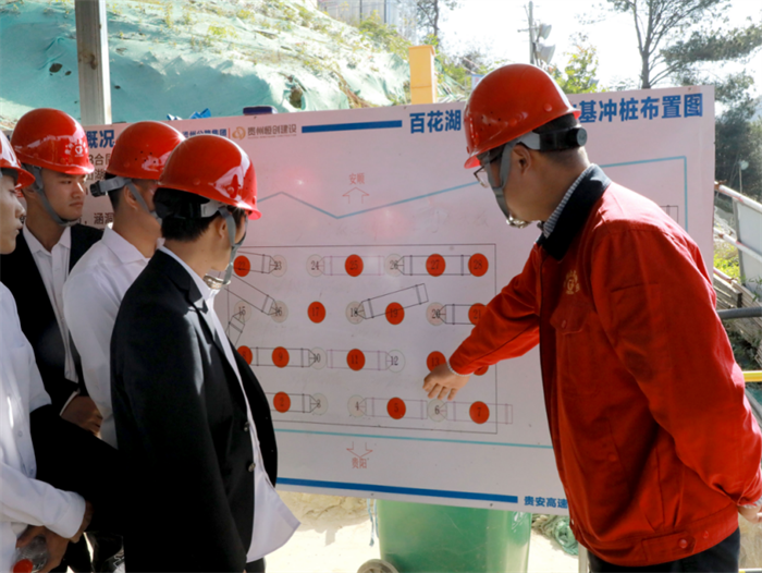 “万丈高楼平地起”,大桥的桩基相当于大桥的“脚”,稳固的底盘才能确保主塔“立得住”,一座大桥的桩基稳不稳,直接关系到大桥建造的质量好不好,百花湖特大桥主塔毗邻百花湖水库,桩基岩溶发育为“串珠式”溶洞,溶洞之间存在与百花湖水库贯通情况,项目施工难度大、环保要求高。
