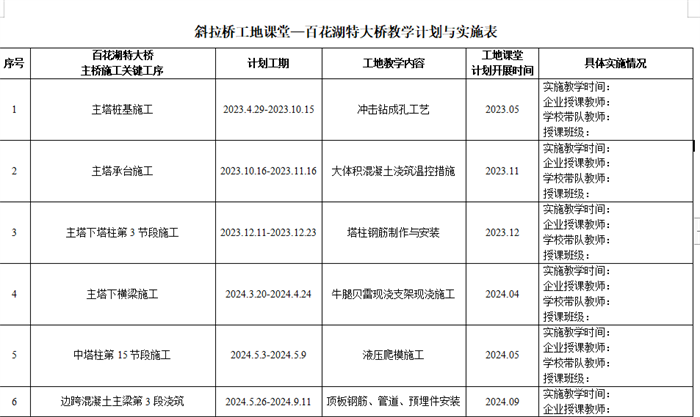 百花湖特大桥“工地课堂”教学计划与实施表