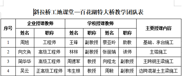 在项目建设现场,我们发现了两张特别的表格,一张是“‘工地课堂’教学计划与实施表”,另一张则是“‘工地课堂’教学团队表”,表格上的内容按照大桥的关键工序和工期,制定了不同的教学内容,而授课教师除了学校的老师之外,还有项目现场的工程师们。这是一个怎样的“工地课堂”?学生们在这里可以学到哪些知识?带着这些疑问,我们走进了百花湖特大桥的“工地课堂”。