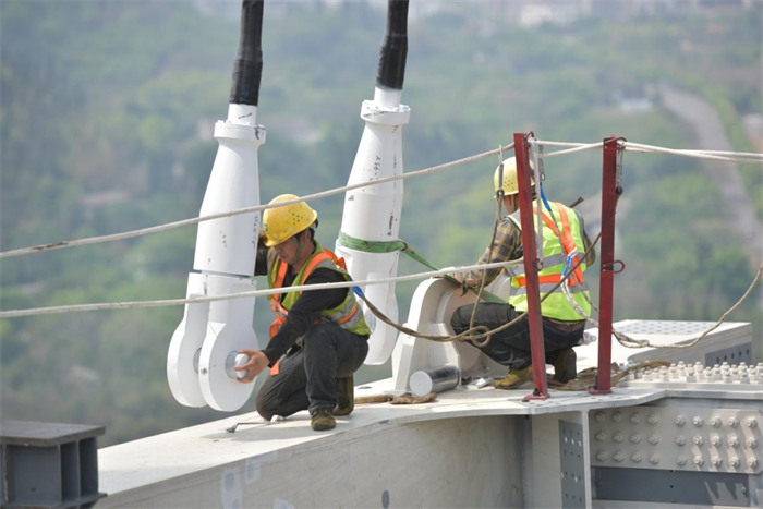 工人将钢桁梁与吊索进行连接