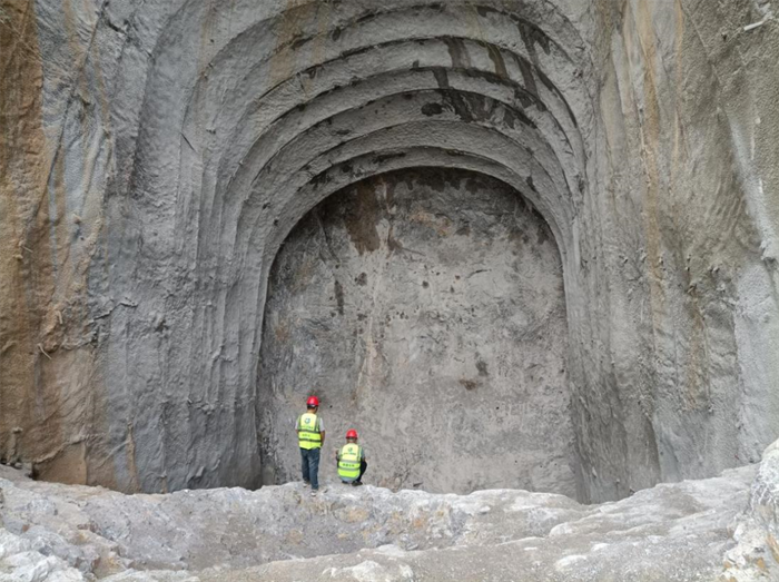 本次验收的六车河特大桥11号拱座是拱桥的重要组成部分,11号拱座采用圆端形实心断面,其横截面由14米×10.94米的矩形和半径7米的半圆组成,沿轴向长度25米方向均为等截面设计,单幅硐室断面面积为230.13立方米,最大倾角39.055度。