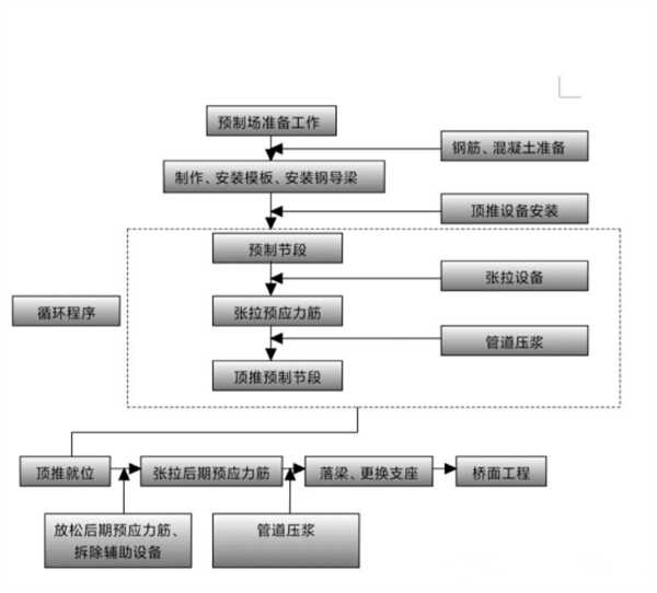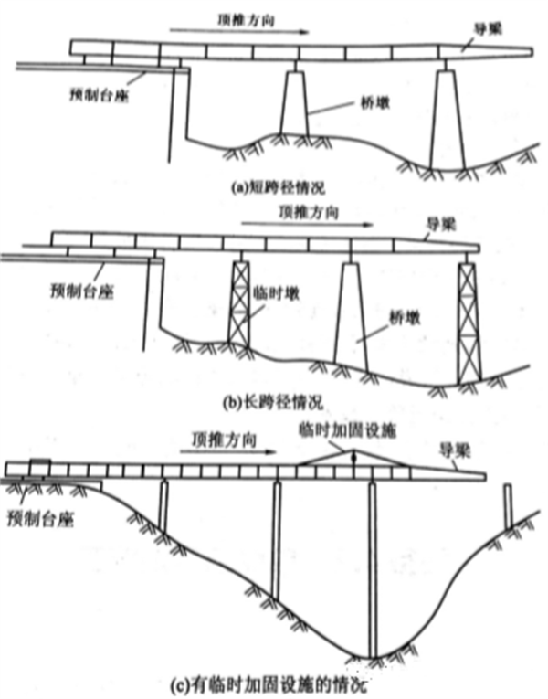 在沿桥轴线方向的桥台后设置施工场地,布设钢导梁和临时墩、滑道、水平千斤顶等施力装置,分节段预制混凝土梁段,用纵向预应力筋连成整体,在梁体前安装长度为顶推跨径0.7倍左右的钢导梁,然后通过水平千斤顶施力,将梁体向前方顶推出施工场地,再在空出的制梁台座上继续下一梁段浇注,这样反复循环施工的方法即顶推法施工。