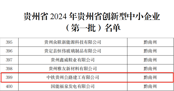 近日,贵州省工业和信息化厅公布了“2024年贵州省创新型中小企业(第一批)名单”,由贵州公路集团与中铁科工集团合资成立的中铁贵州公路建工有限公司(简称“中铁贵州公建”)上榜。