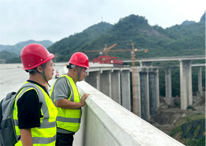 覃勇(右)、袁海(左)在顶云枢纽互通检查防撞护栏