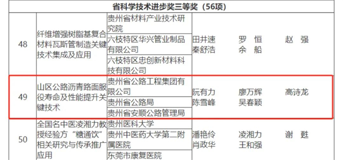 近日,贵州省人民政府公布了“2023年度贵州省科学技术奖授奖项目目录”,贵州公路集团两项重要成果——《喀斯特地区高速公路绿色建造及低碳运维关键技术》与《山区公路沥青路面服役寿命及性能提升关键技术》分别荣获贵州省科学技术进步奖二等奖和三等奖。