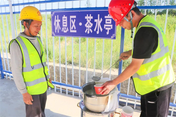 硚孝二标钢筋房工人在烈日下工作后,喝到了项目部送来的绿豆汤