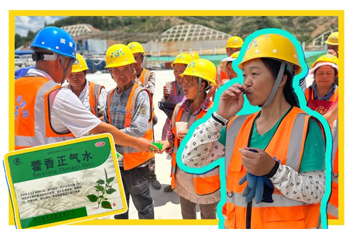 藿香正气水具有预防和缓解中暑症状的作用,还可以缓解因高温天气出现的头晕、头痛、恶心、呕吐、胃肠不适等轻微中暑症状,帮助工人快速恢复良好的工作状态。贵平房建2标准备了藿香正气水,确保一线工人在高温天气维持健康身体状态。