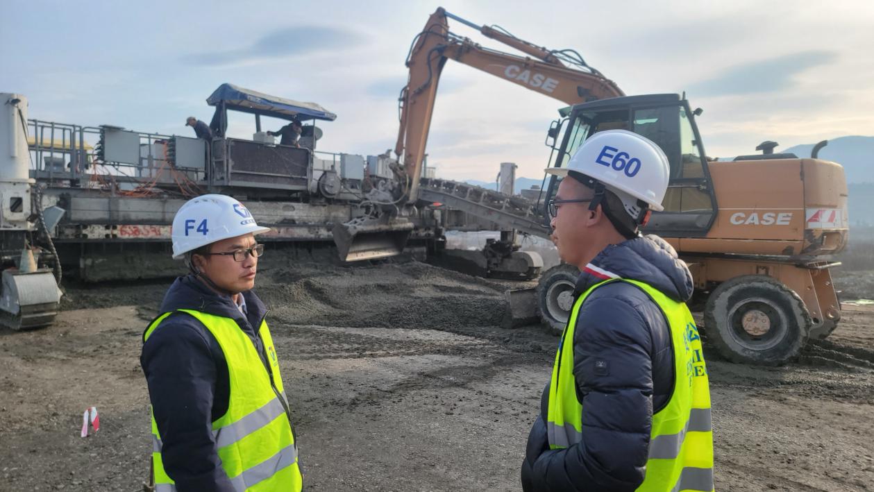 易剑凯(左)检查格鲁吉亚项目路面摊铺工作