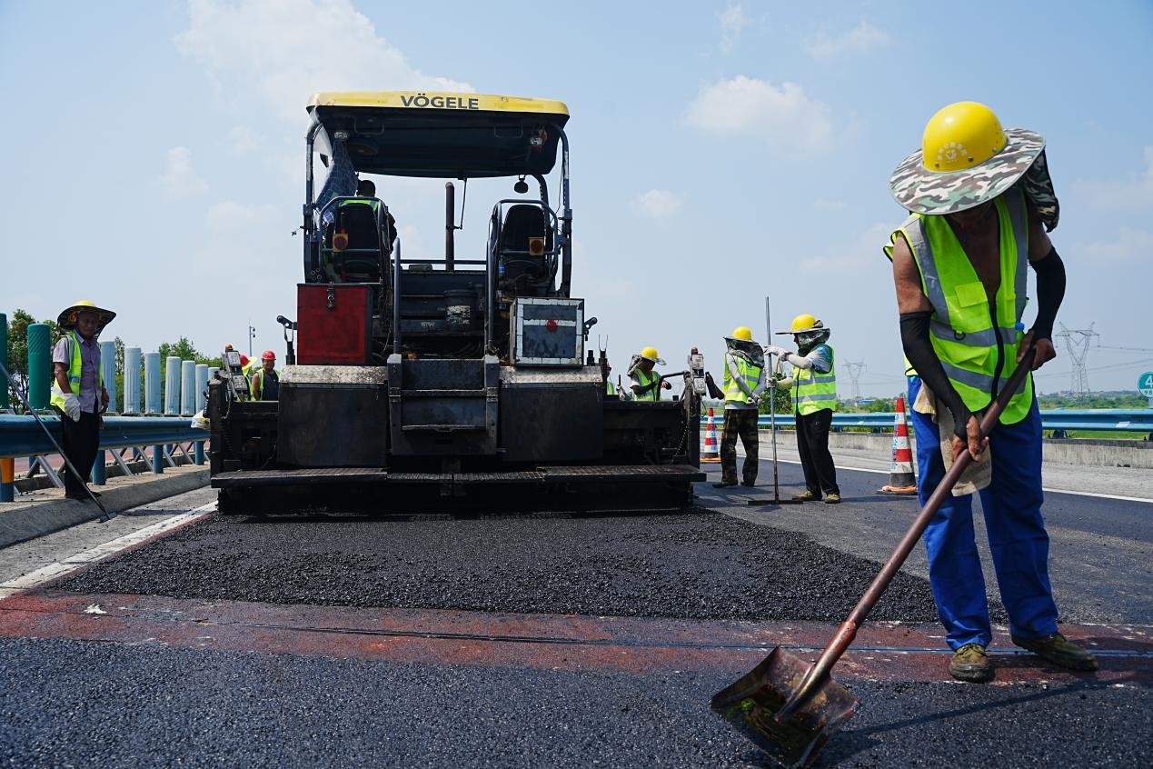 施工期间,项目所在地武汉的平均气温基本在38度以上,而现场沥青混合料的温度则是170度,两相结合之下,导致施工现场范围的气温高达60度。驻足看去,施工现场到处都是热浪滚滚,仿佛扭曲了空气。“持续的高温环境,对我们现场人员和机械设备都是一个巨大考验。”尹波说。