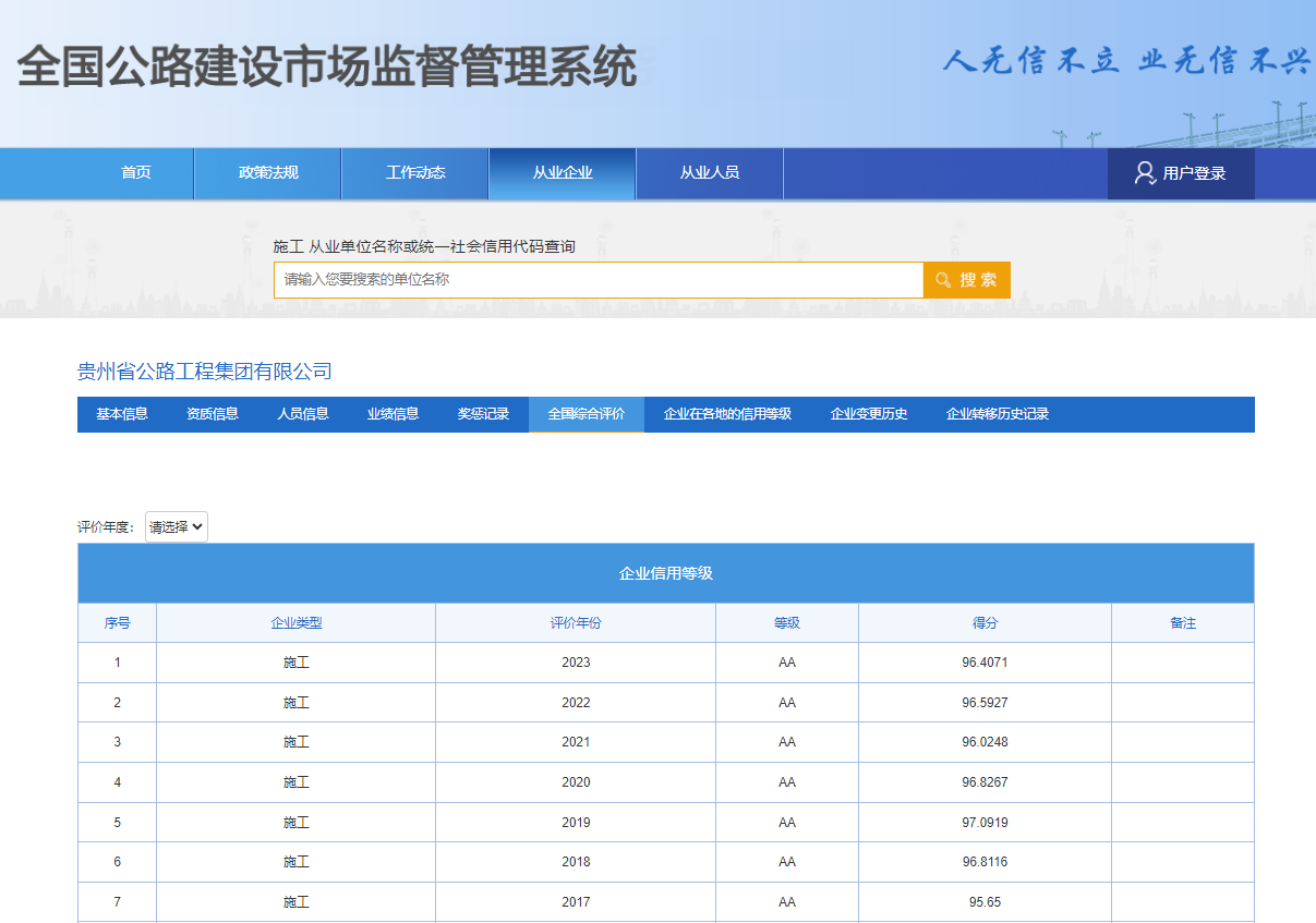 信用评价是对施工企业投标行为和履约行为等进行的综合评价,是为增强公路施工企业诚信履约意识,促进行业自律的一项重要举措。公路施工企业全国综合信用评价是由交通运输部根据省级交通运输主管部门或其委托机构提交的信用评价结果,通过量化方式对具有公路施工资质的企业在公路建设市场从业行为进行的评价,“AA”等级为公路施工企业的最高评级,是交通主管部门对企业专业实力、诚信履约能力的高度认可和肯定。