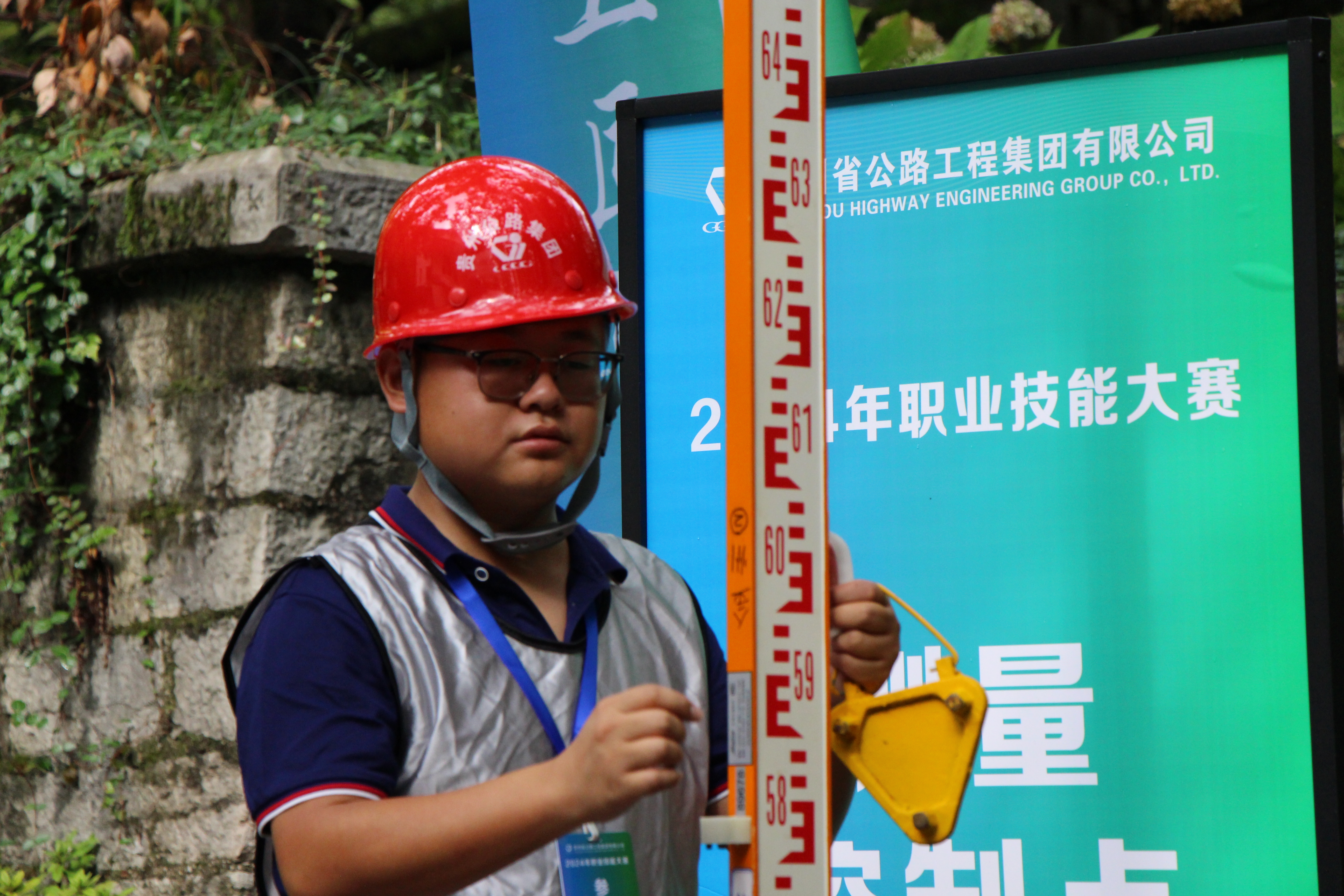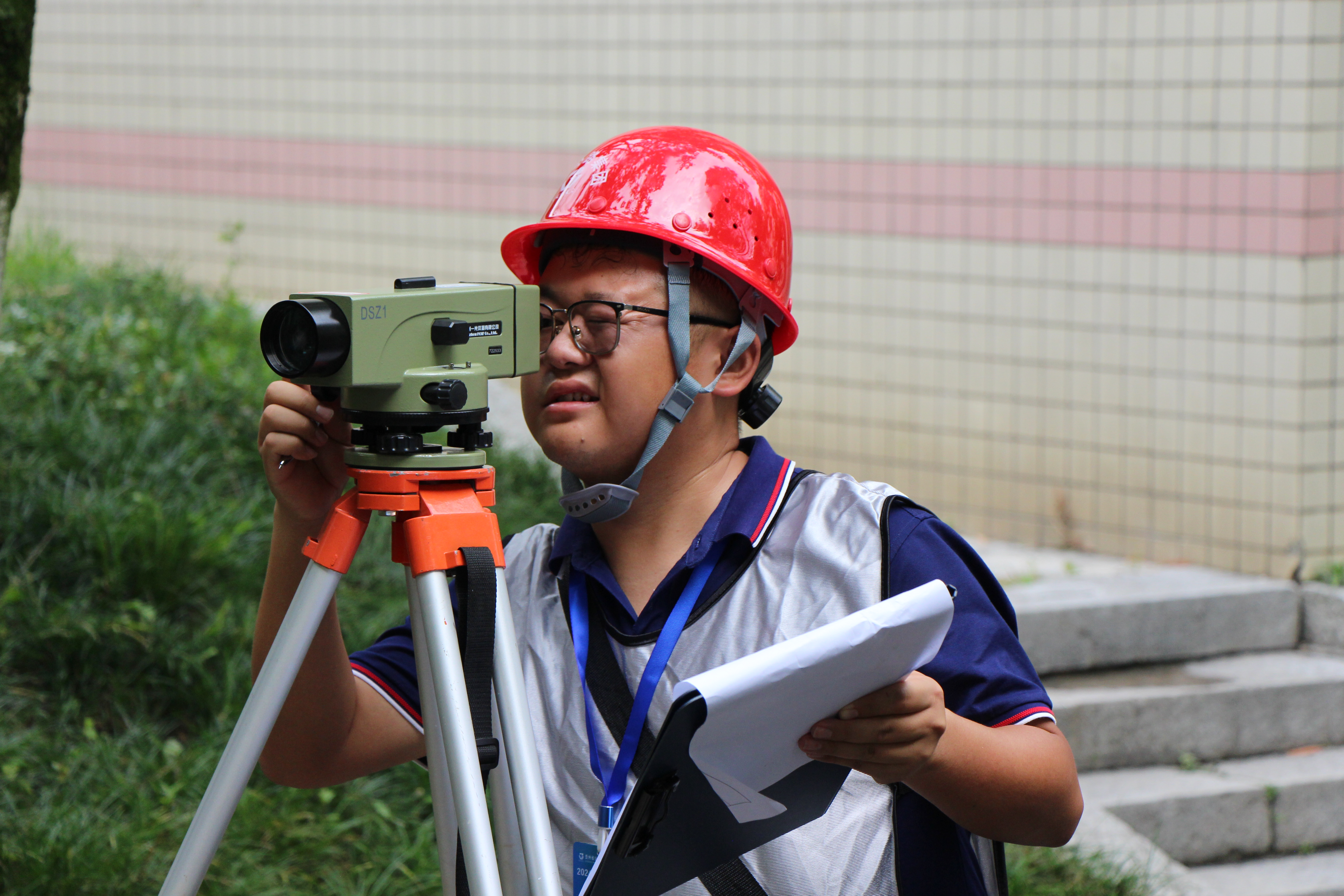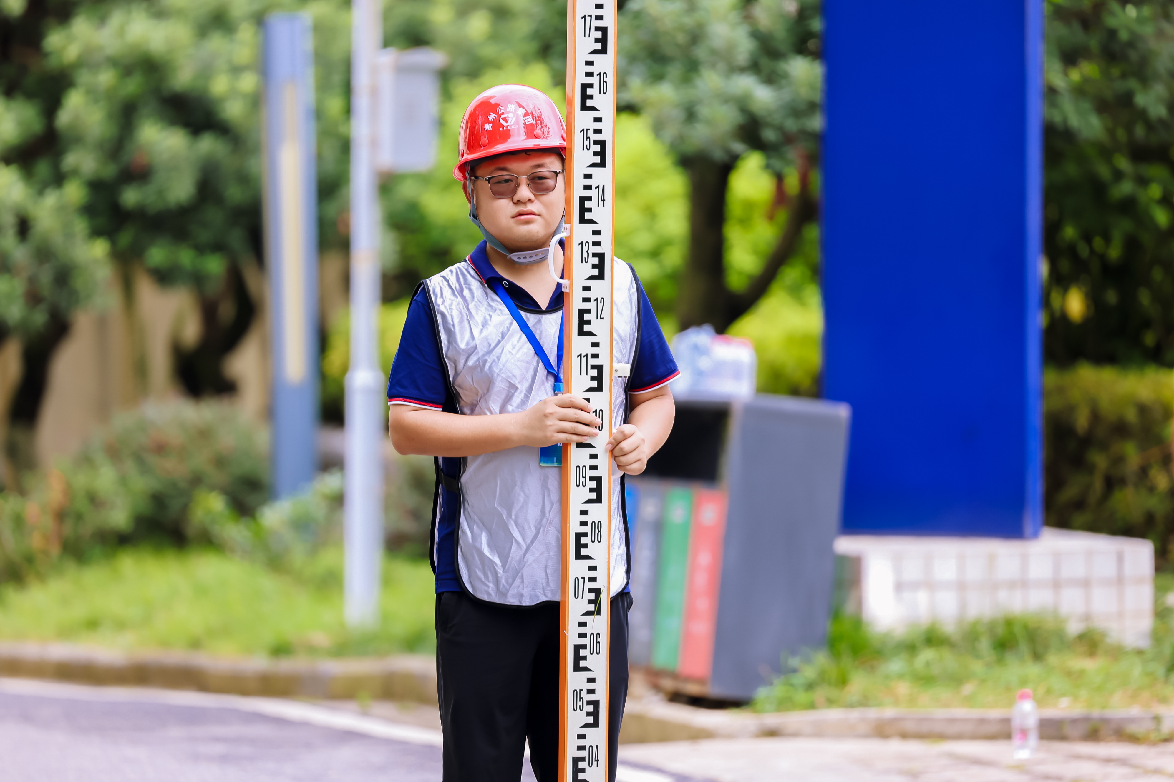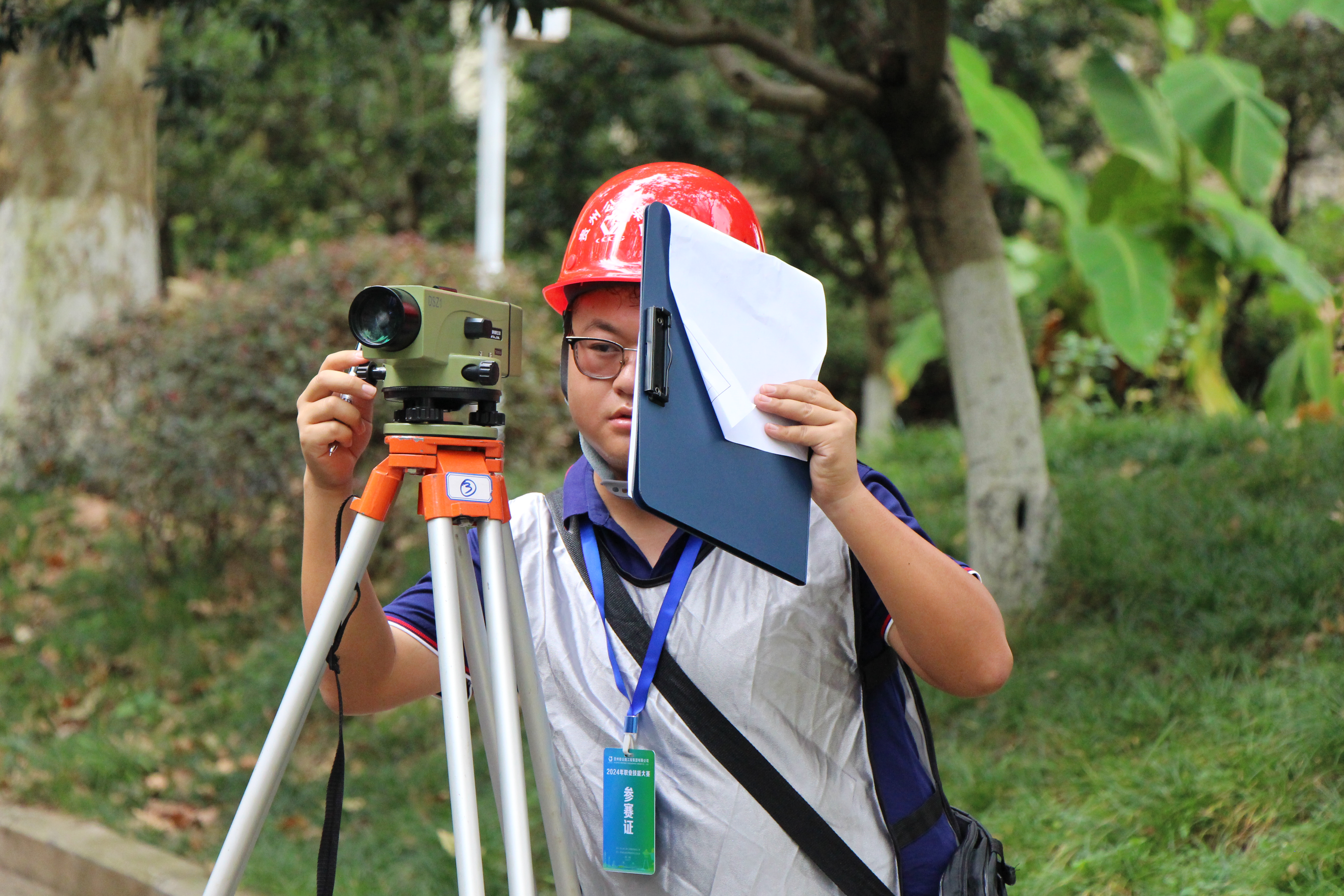 “前视塔尺请保持原位”“后视塔尺再向前移动0.5米”,在比赛的第一站,颜毫兴和队友默契配合、不急不躁、稳扎稳打,在高效完成检测工作的同时更不失精度,为后续的比赛开了一个好头。