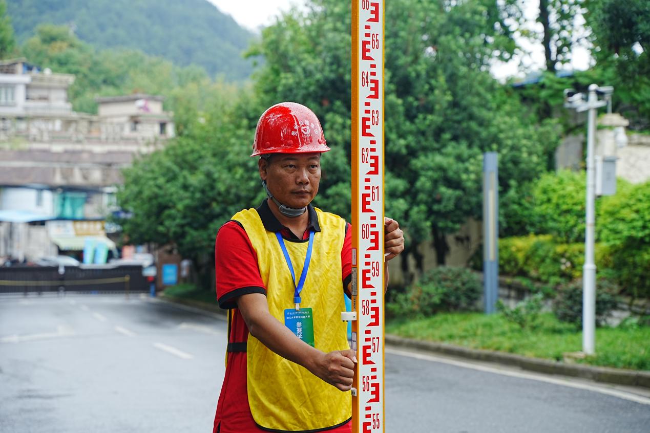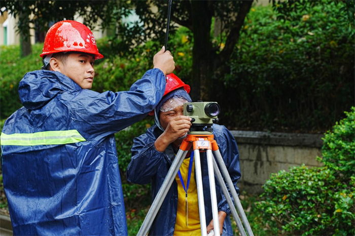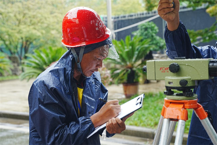 龚飞在暴雨中进行测量