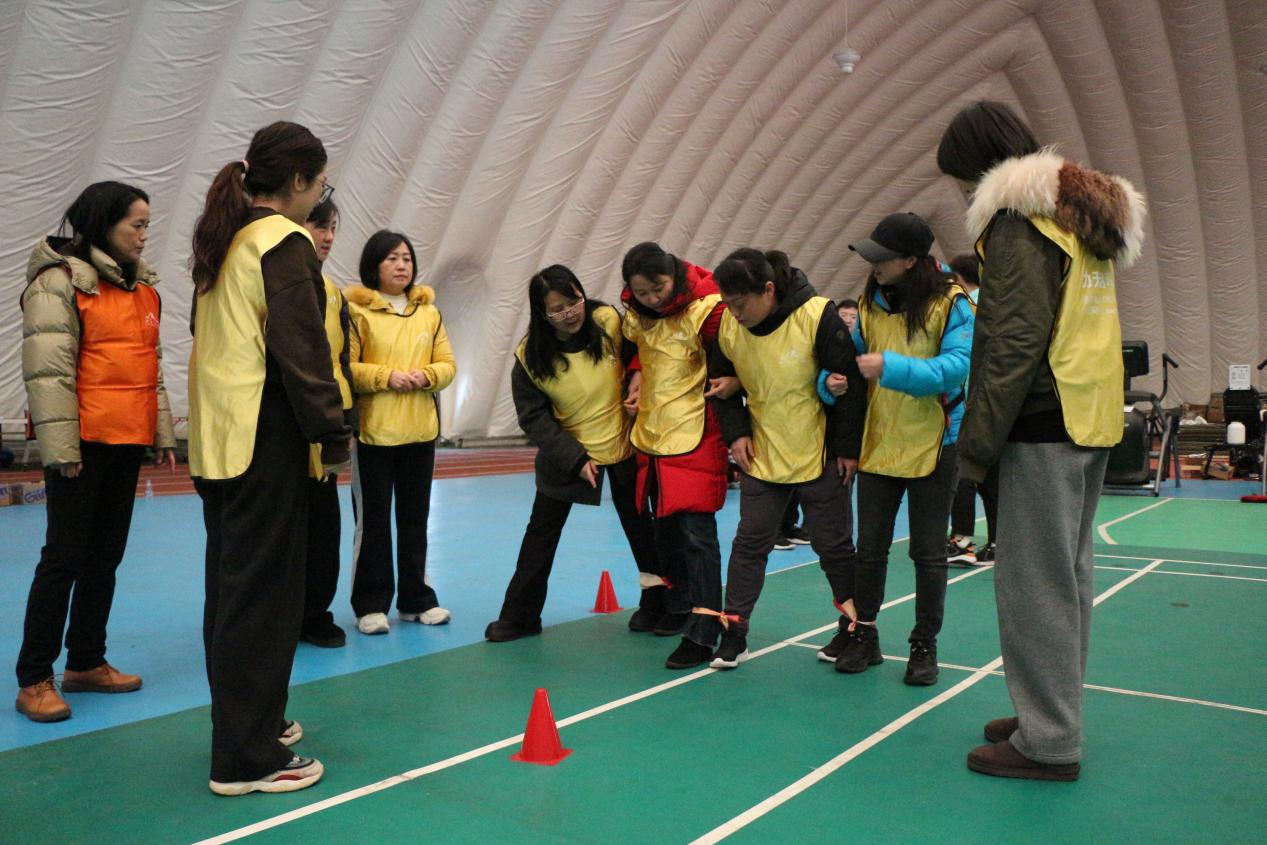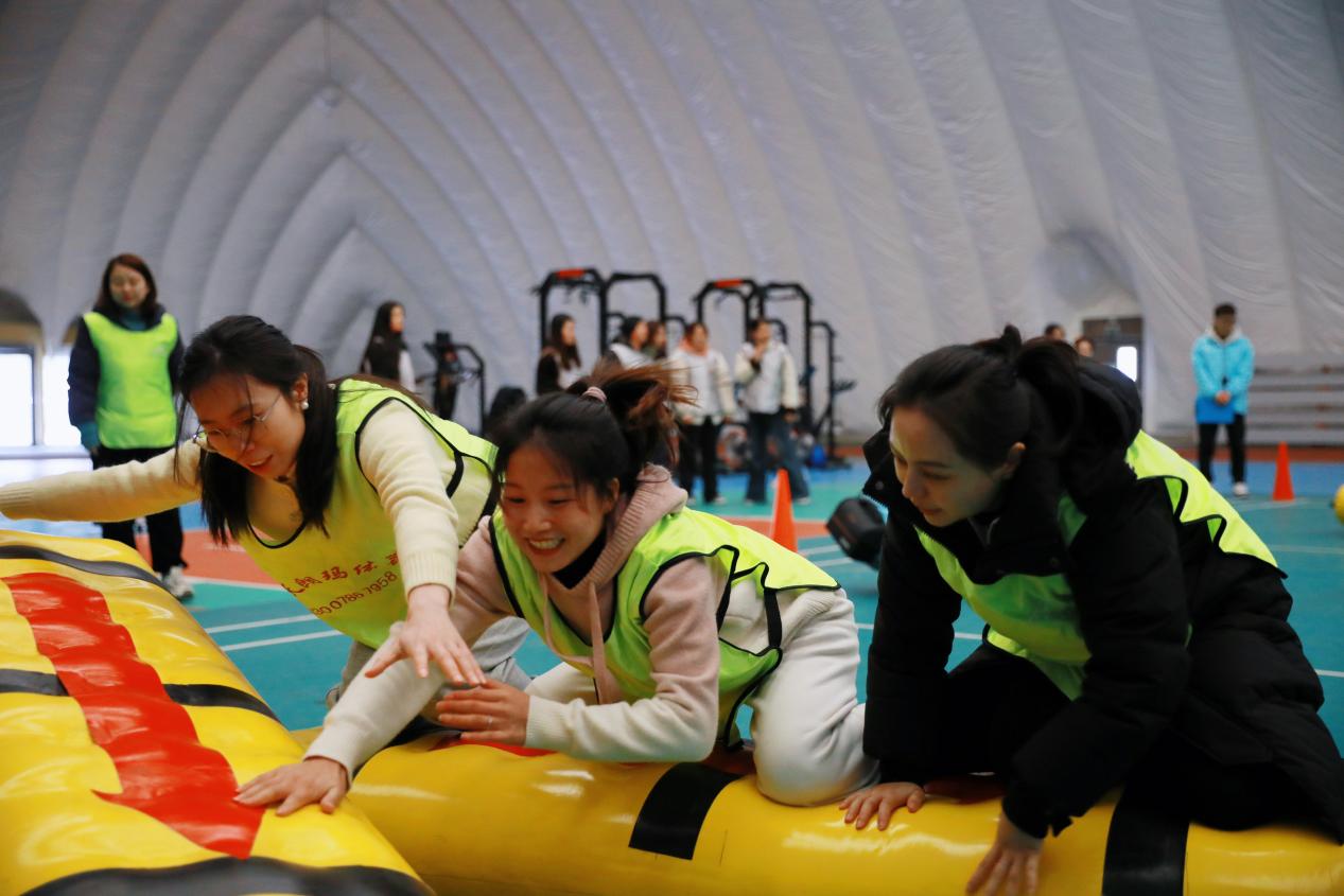 学法环节刚结束,现场秒变“大型团建现场”。“企鹅漫步”赛道上,大家抱着瑜伽球摇摇晃晃,像极了QQ表情包;“四人五足”环节,虽然喊着“一二一”却集体顺拐;“同舟共济”环节,大家挥洒汗水、团结协作,展现出巾帼不让须眉的飒爽英姿。
