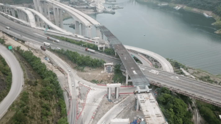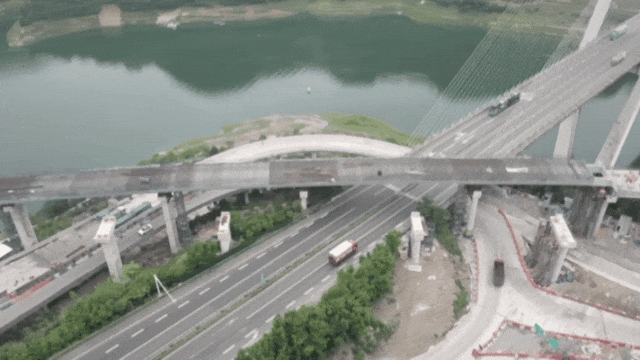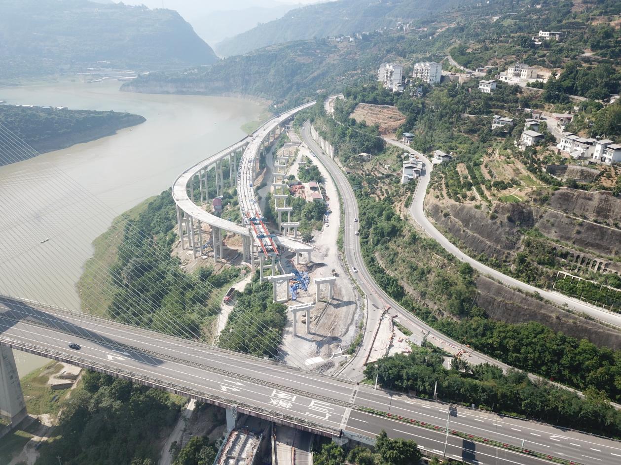 在建的重庆奉建高速唐家湾特大桥,是全线重点控制性工程——奉节东枢纽互通的主线桥。大桥位于重庆市奉节县费门街道与沪蓉高速夔门互通附近,沿长江支流梅溪河岸线布置,跨越2条支流溪沟汇入口、1条石油管道,以及通行的G12沪蓉高速、奉溪高速,施工环境极为复杂。在施工过程中,项目建设团队以不同工艺应对复杂地形,将大桥建成一座集预制T梁、现浇箱梁、连续刚构箱梁、钢混叠合梁四种工艺于一身的桥梁施工“活体博物馆”。