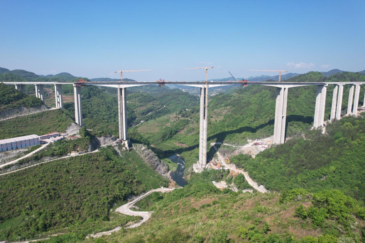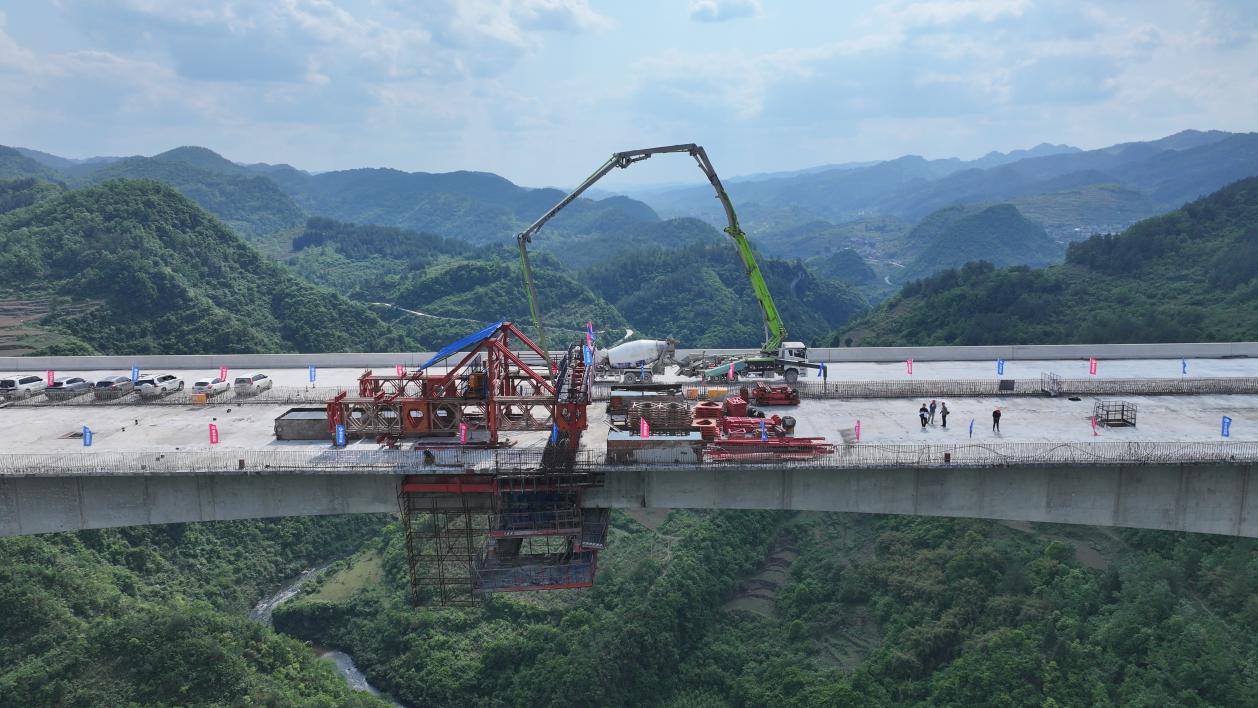 据了解,南明河大桥是贵平高速全线重点控制性工程,全长1129.8米,于2023年4月26日开工建设。大桥地处贵阳市乌当区下坝镇岩山村,横跨南明河,设有3个T构,最大主跨180米,最大墩高175米。桥梁上构设有20个标准节段,按照“先边跨合龙、后中跨合龙”的顺序逐步浇筑。截至目前,贵平2标的整体形象进度已达到95.36%,路基、桥梁、隧道工程分别完成90%、97%、100%。
