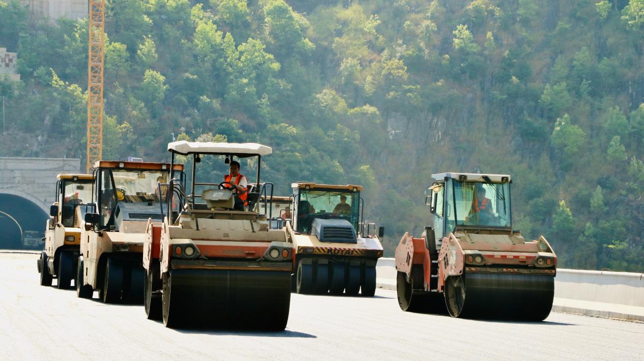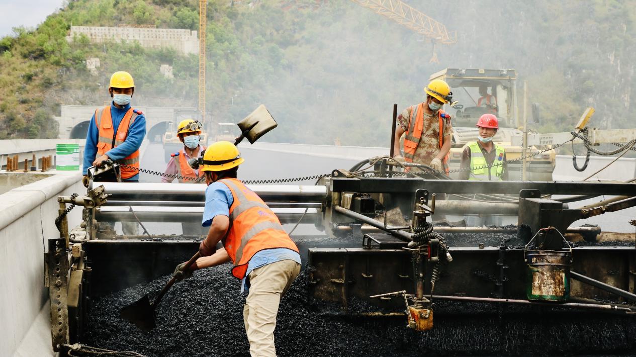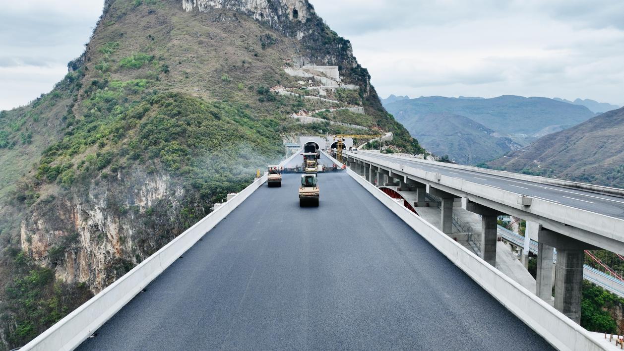4月24日,在贵州公路集团第八工程公司承建的纳晴高速乌蒙山大桥路面施工现场,随着最后一车沥青混合料均匀摊铺完成,乌蒙山大桥路面沥青摊铺工程顺利收官,总体形象进度已达99%。