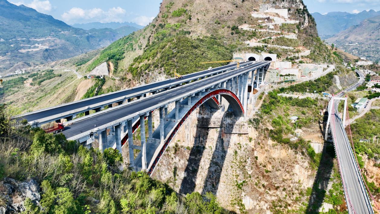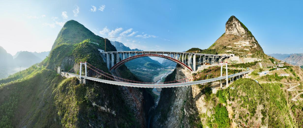 纳晴高速乌蒙山大桥位于六盘水市六枝特区中寨乡,为跨越阿志河谷及两侧斜坡而建设,是纳晴高速重点控制性工程之一。主桥跨径270米,左幅全长491.5米,右幅全长511.5米。乌蒙山大桥建成后将成为世界首座钢桁腹杆-混凝土组合拱桥,形成山区大跨度钢桁腹杆-混凝土组合拱桥的施工技术体系,丰富200米至400米跨径的桥梁结构类型,将成为我国具有里程碑意义的桥梁。