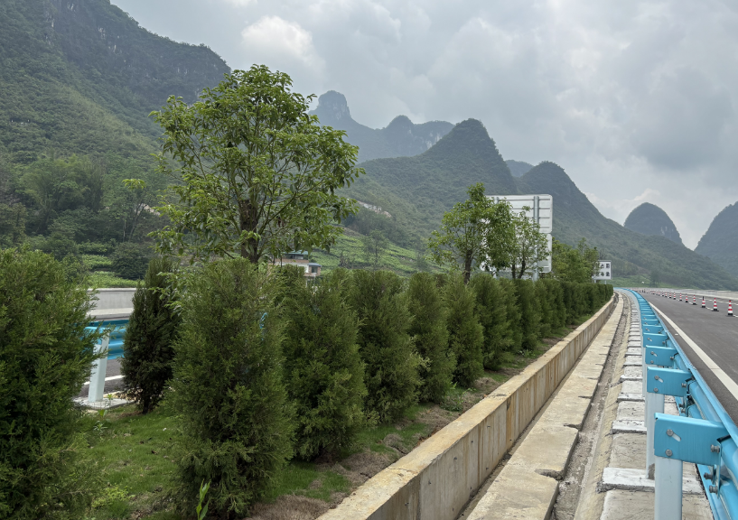 由贵州林都园林工程有限公司承建的广西河荔高速景观绿化工程,全长69.3公里,包含标段内中央分隔带、主线及互通匝道碎落台、互通式立交、隧道出入口区域、隧道洞门装饰等景观绿化工程。