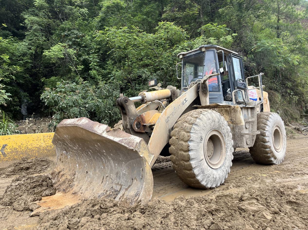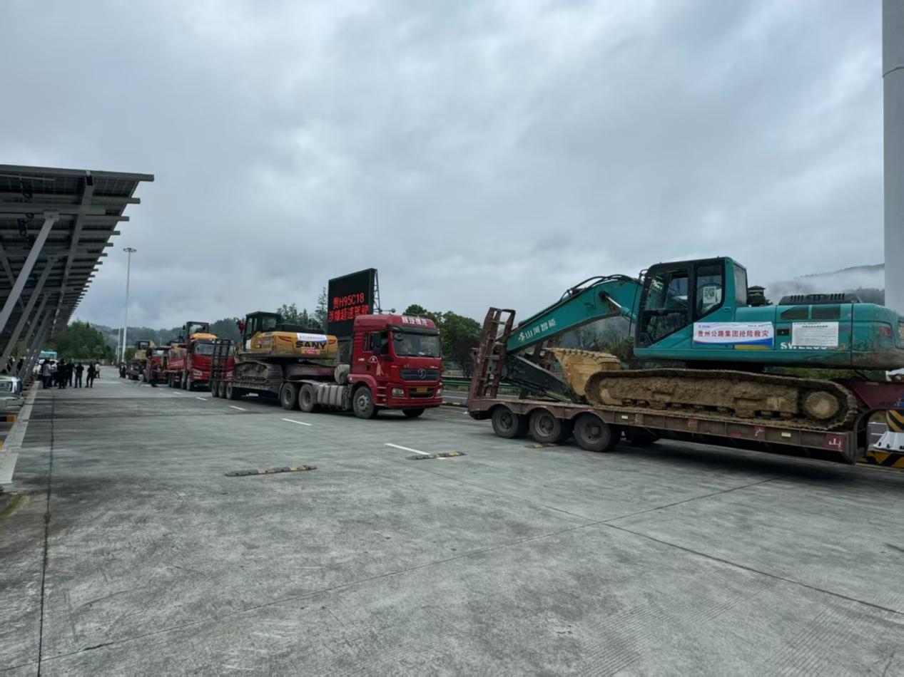 当天,集团调配的5台装载机、14台挖掘机、8台拖车、8辆工程车及发电机、安全帽、救生衣等抢险物资陆续抵达月亮山服务区,整装待发。
