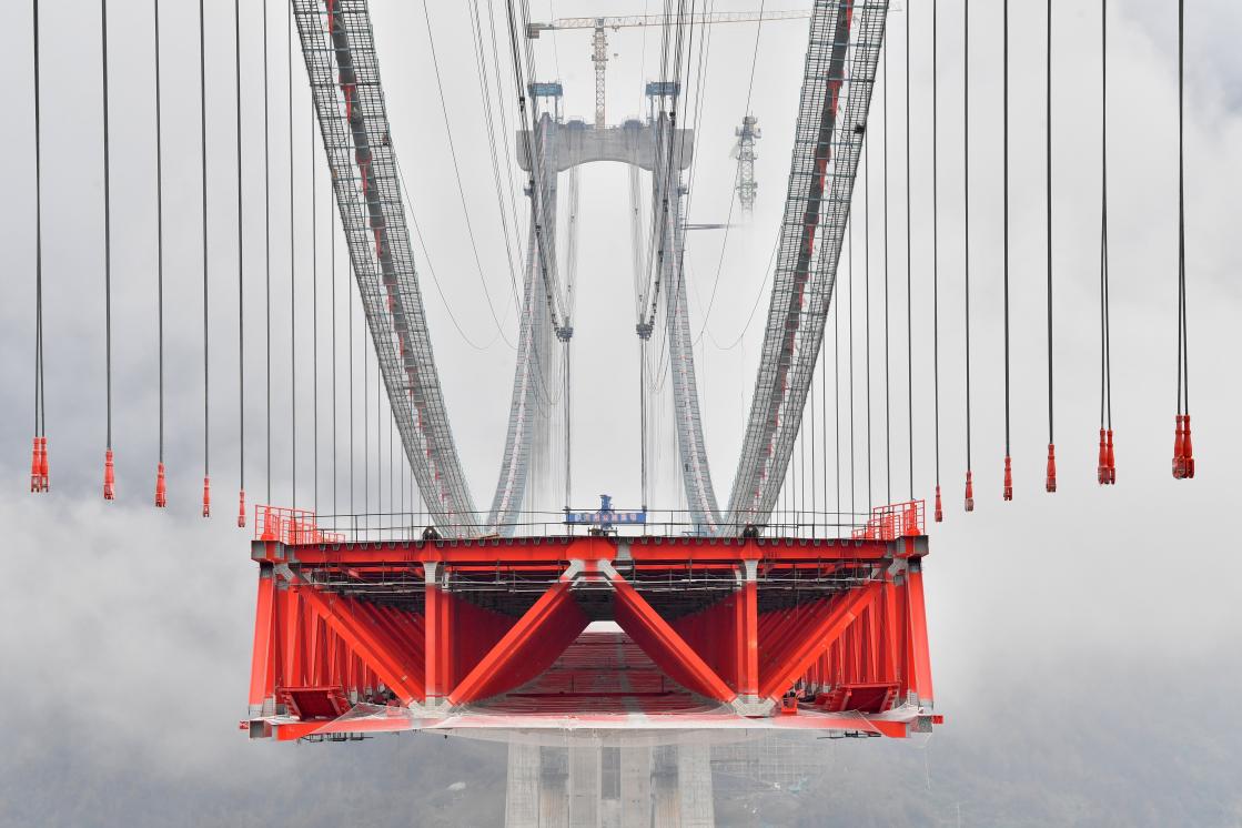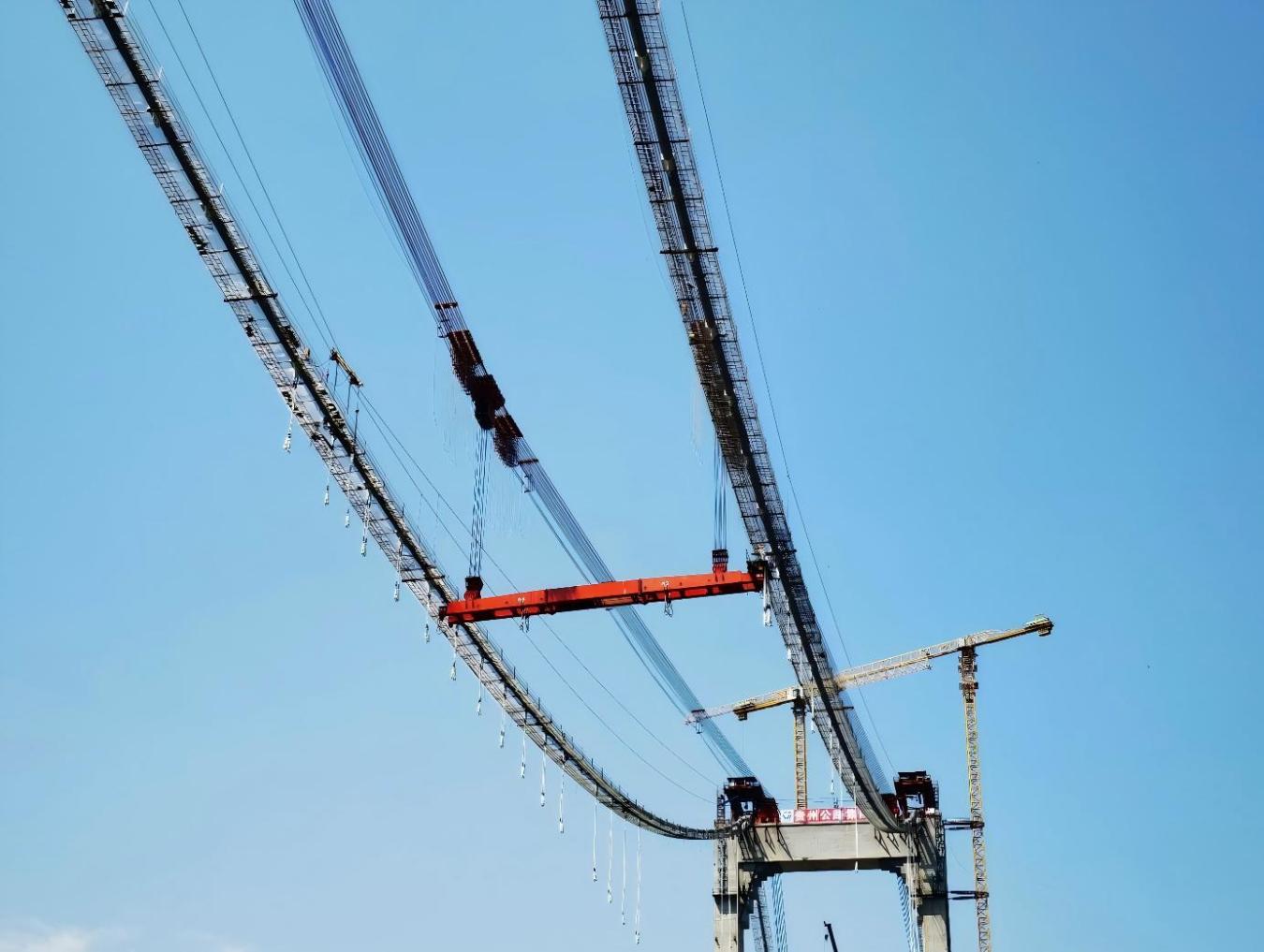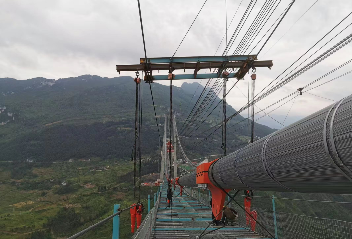 牂牁江大桥为主跨1080米的双塔单跨钢桁梁悬索桥,全桥共设有索夹242个、吊索296根。其中,单个索夹最大重量为7.5吨,单根吊索最长116.743米、最大重量为1.82吨。