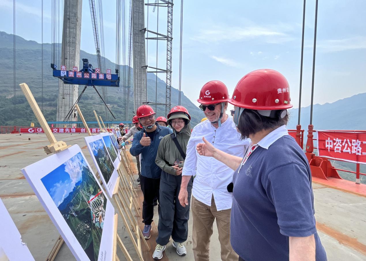 2024年4月28日,中外著名摄影家在牂牁江大桥合龙现场观看大桥建设成长摄影展,对建设者的艰难不易与大桥的雄伟壮观称赞不已。