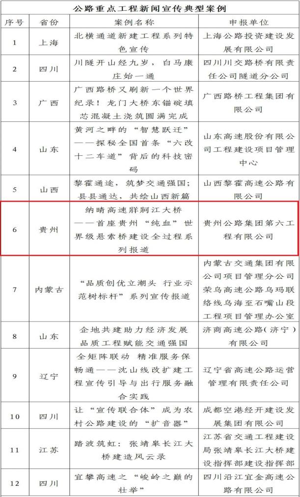 日前,由《中国公路》杂志社组织开展的2024年度“公路重点工程新闻宣传典型案例”系列征集活动公布评选结果,贵州公路集团第六工程有限公司申报的《纳晴高速牂牁江大桥——首座贵州“纯血”世界级悬索桥建设全过程系列报道》成功入选,成为本年度贵州唯一获此殊荣的案例。