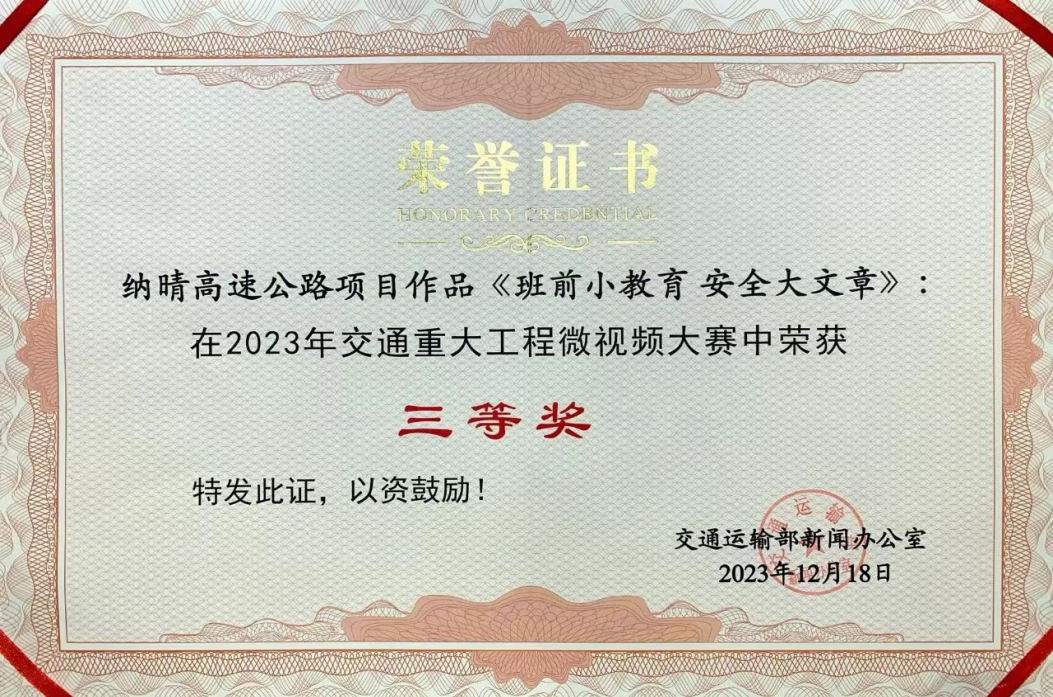 《班前小教育 安全大文章》微视频作品斩获2023年全国交通重大工程微视频大赛三等奖