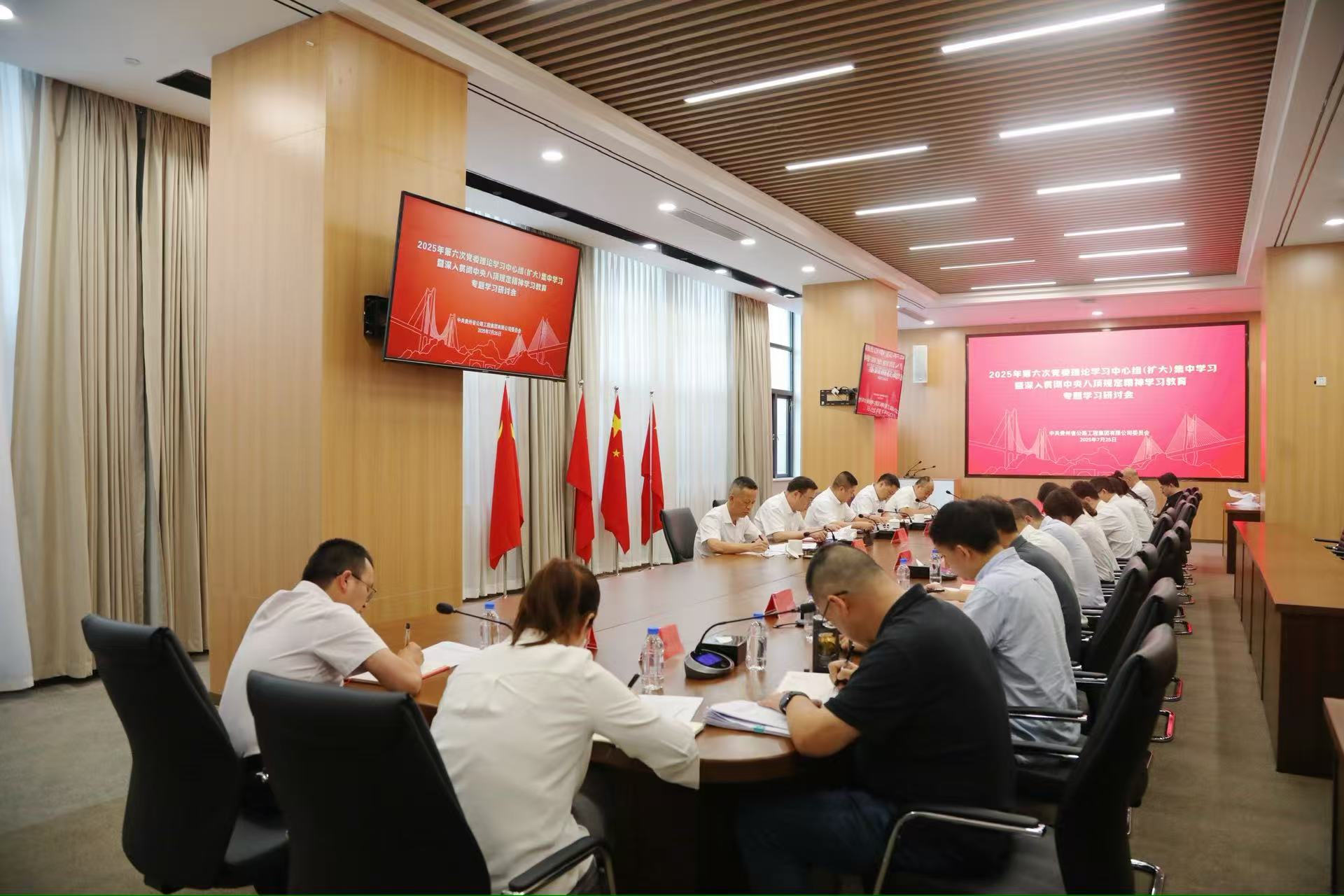 7月25日,贵州公路集团召开2025年第六次党委理论学习中心组(扩大)集中学习暨深入贯彻中央八项规定精神学习教育专题学习研讨会。集团党委书记、董事长马白虎主持会议并提工作要求,在家领导班子成员朱明聪、崔文武、张德顺、黄任远围绕学习主题作研讨发言。