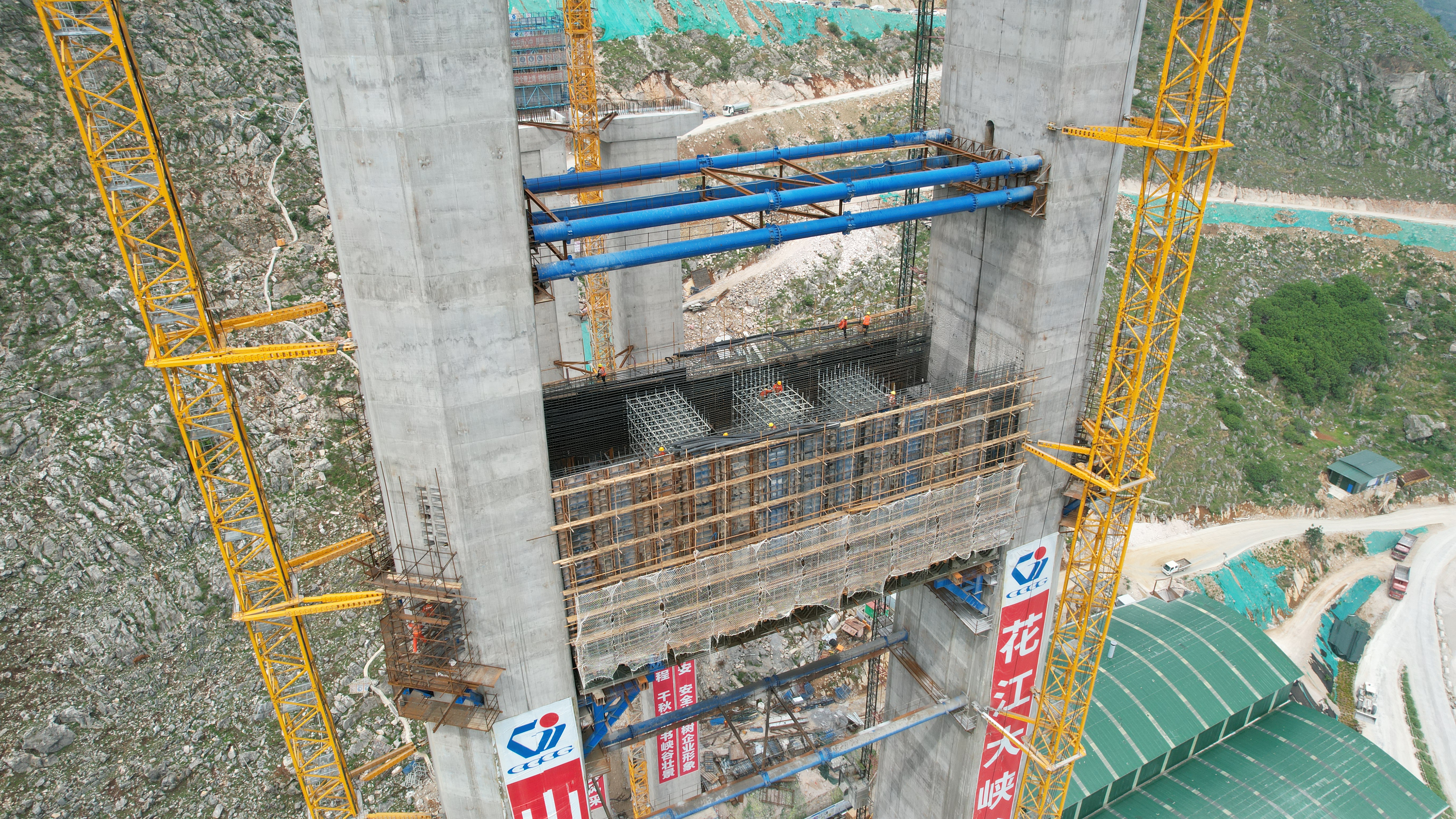 横梁是主塔的关键承重结构,也被称作大桥的“脊梁”。花江峡谷大桥5号主塔下横梁长29.4米,宽10.1米,高10米,距离地系梁高度为94.5米,设计方量约达2100立方米,同时具备“高”“大”“重”等特点。项目团队创新使用“无落地支架斜牛腿现浇支架系统”,通过对架体支承结构的专项设计,去除大体量落地支承架体,有效减少高空人员作业和高空吊装作业时间,降低安全风险,也降低对施工堆放场地的要求。
