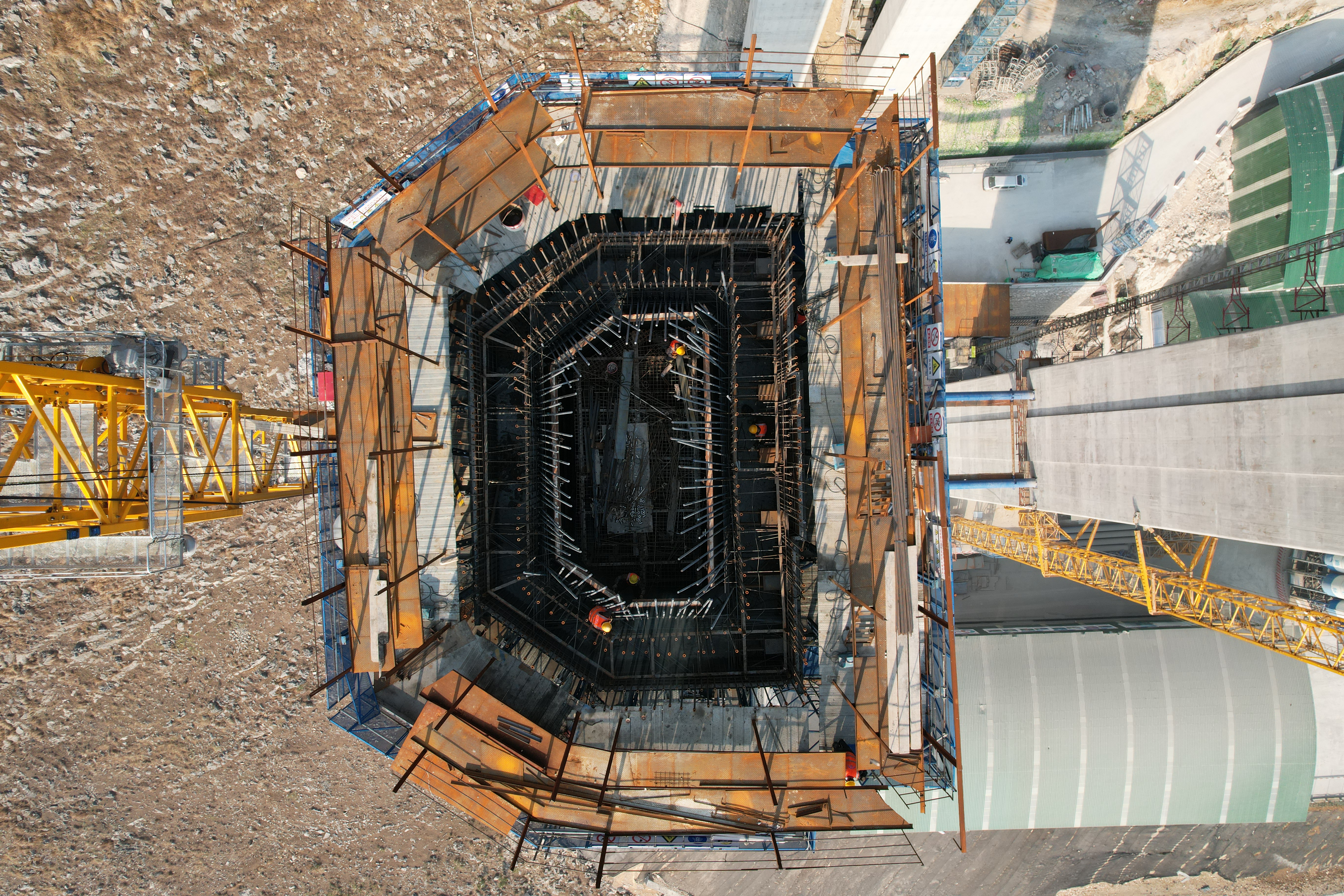 花江峡谷大桥5号主塔高达262米,在同类型桥梁中索塔较高、体量较大,主塔塔身为变截面八面体结构,向内对向倾斜,塔身混凝土强度等级较高。面对如此高难度的主塔结构,“技术创新”“方案比选”是掌握在项目团队手中最关键的“取胜密钥”。